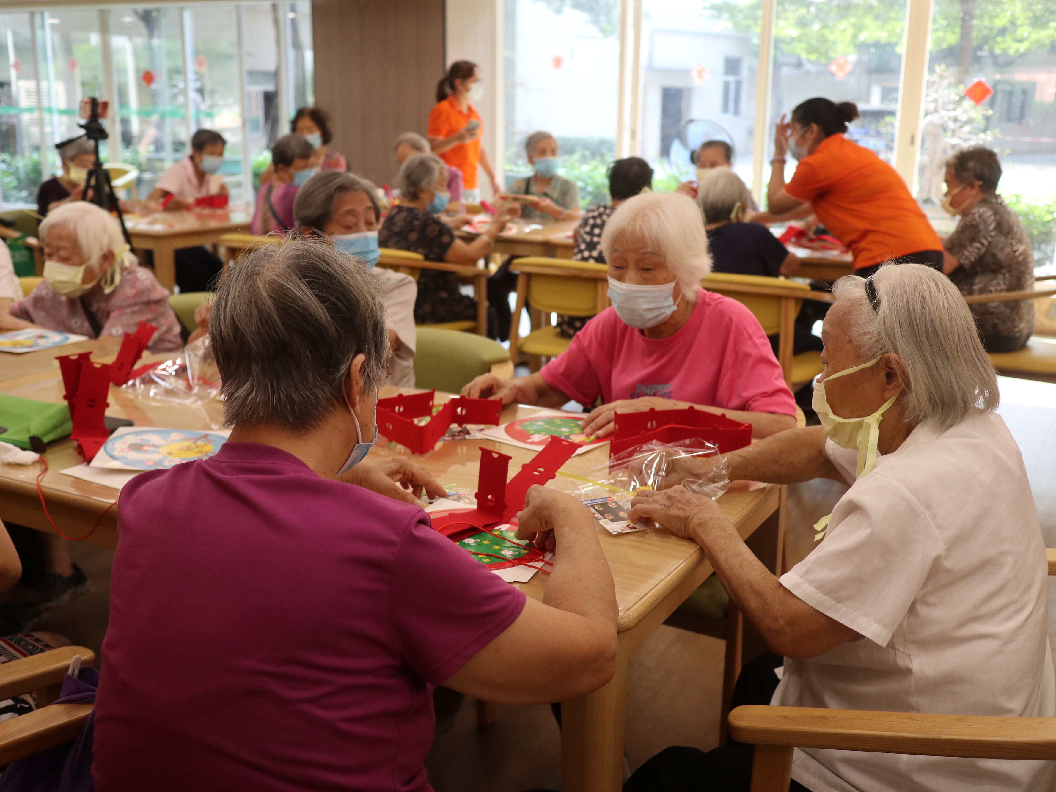 广州市松鹤养老院的长辈们在做灯笼在广州市各大养老院里,为认知症长辈设计各种手工活动,已经成为常规项目。像制作曲奇、月饼和灯笼这种手工活动,过程其乐融融,既刺激到了认知症长辈的视觉、触觉与嗅觉,又能有效促进他们的互动交流。