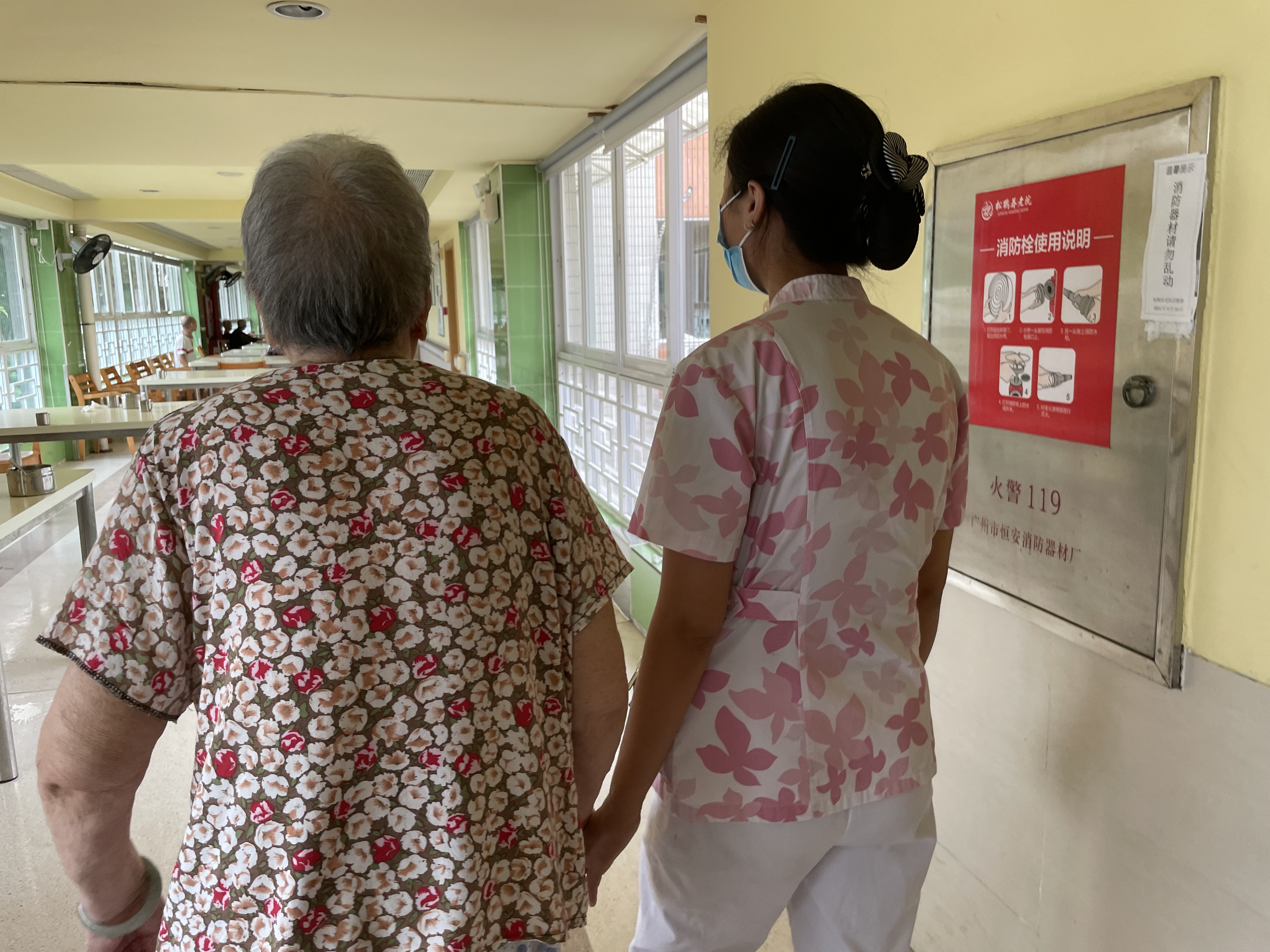 在广州市昊琛养老院,每天早上,当院里的活跃型长辈起床锻炼,开始活力一天的时候,失智失能长辈也会在护理员的照顾和帮助下,进行洗漱和吃早餐。部分长辈的翻身、换纸尿裤、穿衣、坐上轮椅等,都要护理员细心帮扶。