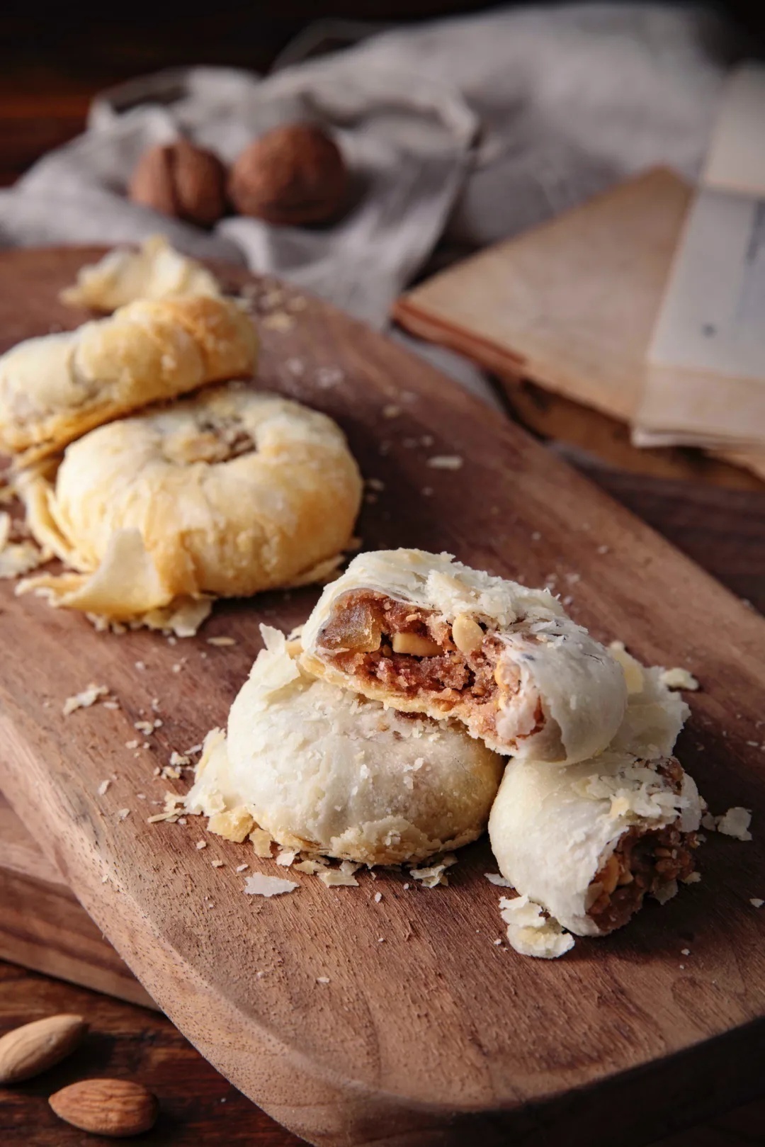 起源于安徽省徽州的徽式月饼,表皮是油酥皮,内馅是用菜、油和糖组合在一起。