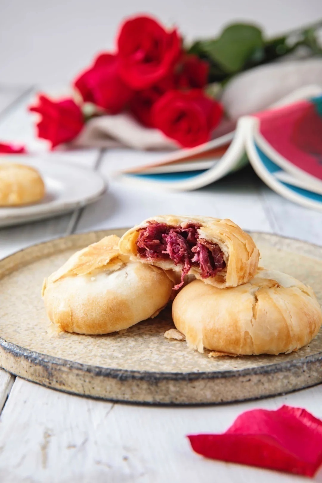 至于自身带着浪漫风情的鲜花饼,处理过的新鲜花瓣全都包入内心。一入口,强烈的玫瑰花味掠夺了口腔,沁人的花香在嘴里萦绕。