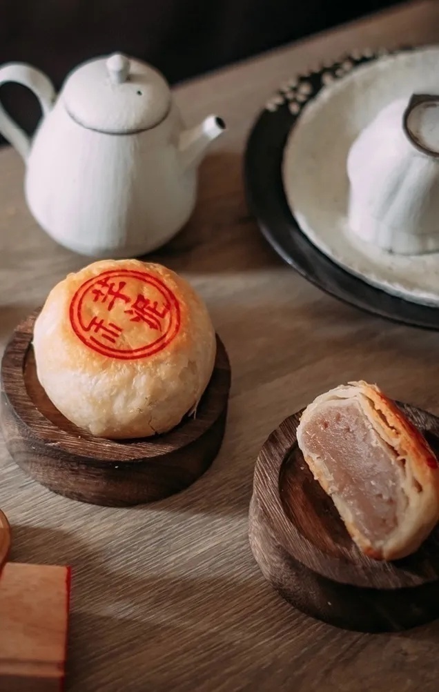 内馅基本以甜的为主,主要代表馅料有绿豆沙和乌豆沙。比起绿豆沙的细腻和绵密,芋饼的口感则更敦实一点,皮酥馅细。
