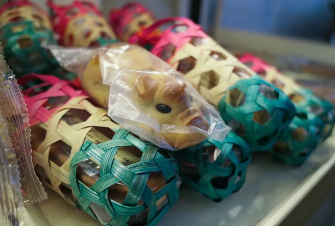 又到一年中秋节,麒昌饼家的公仔饼正排着队被放在展示柜里,一眼就能看到狮子饼、鱼仔饼的身影,那猪仔饼呢?原来一只只猪仔被装进了粉绿相间的小猪笼里,将猪仔拿出来一瞄,那双黑漆漆的眼睛正盯着你,让人看了直呼“好得意”。