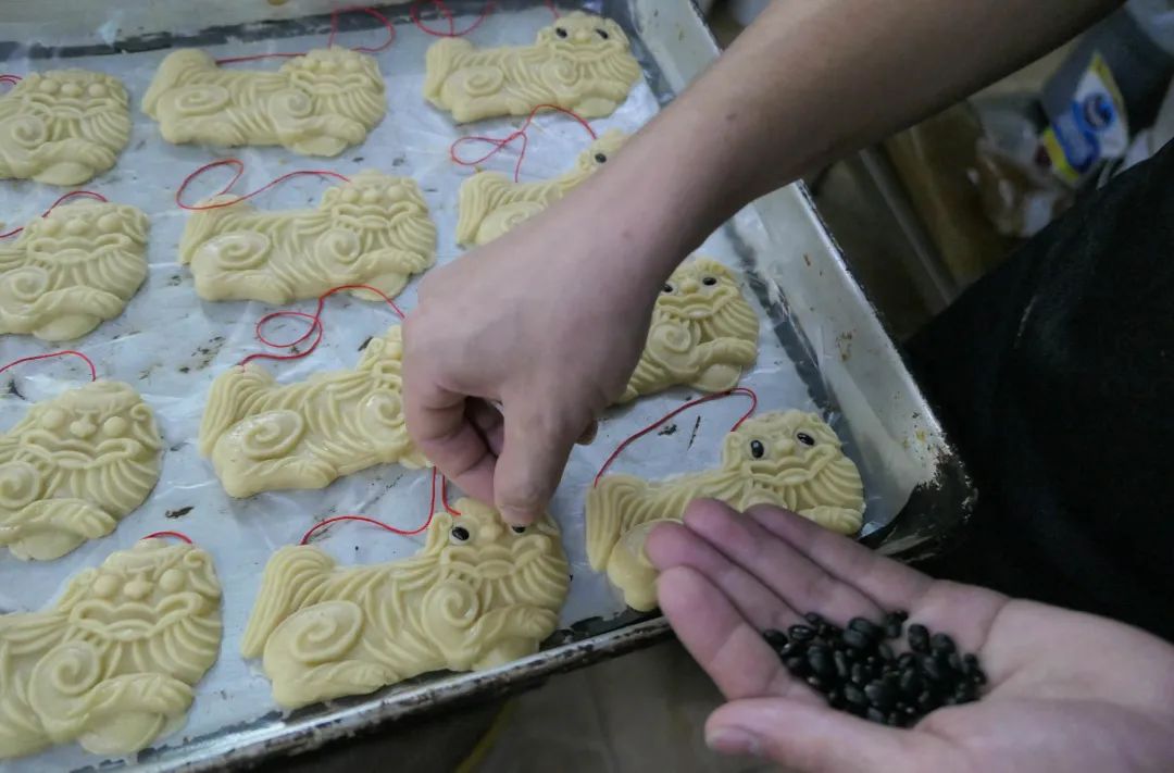 淡黄色的面团是公仔饼的主要构成材料,猪仔饼会在此基础上包裹豆沙馅,经过放红绳、用模具印制后,师傅开始为公仔饼点上“黑豆”眼睛,待一盘20只公仔饼全部点完眼睛就可以放进烤箱。