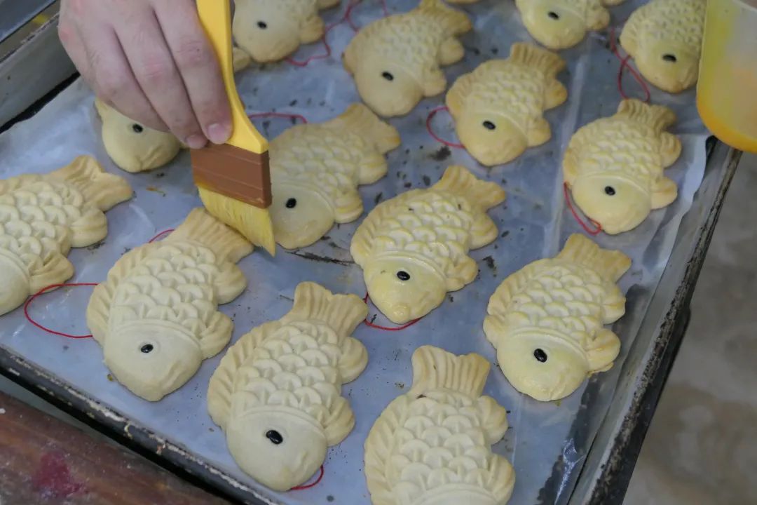 一盘盘公仔饼经过5分钟烘烤定型后被带出烤箱,它们需要在高温后“乘凉休息”10分钟,师傅才为它们轻刷一层蛋黄液,以便起到增加香味、提亮色泽的作用,之后公仔饼再次烘烤10分钟后正式出炉。