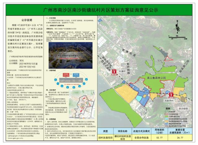 9月15日,由广州南沙经济技术开发区规划和自然资源局组织编制完成的《广州市南沙区南沙街塘坑村片区策划方案》(以下简称“策划方案”)向社会公开征询意见。