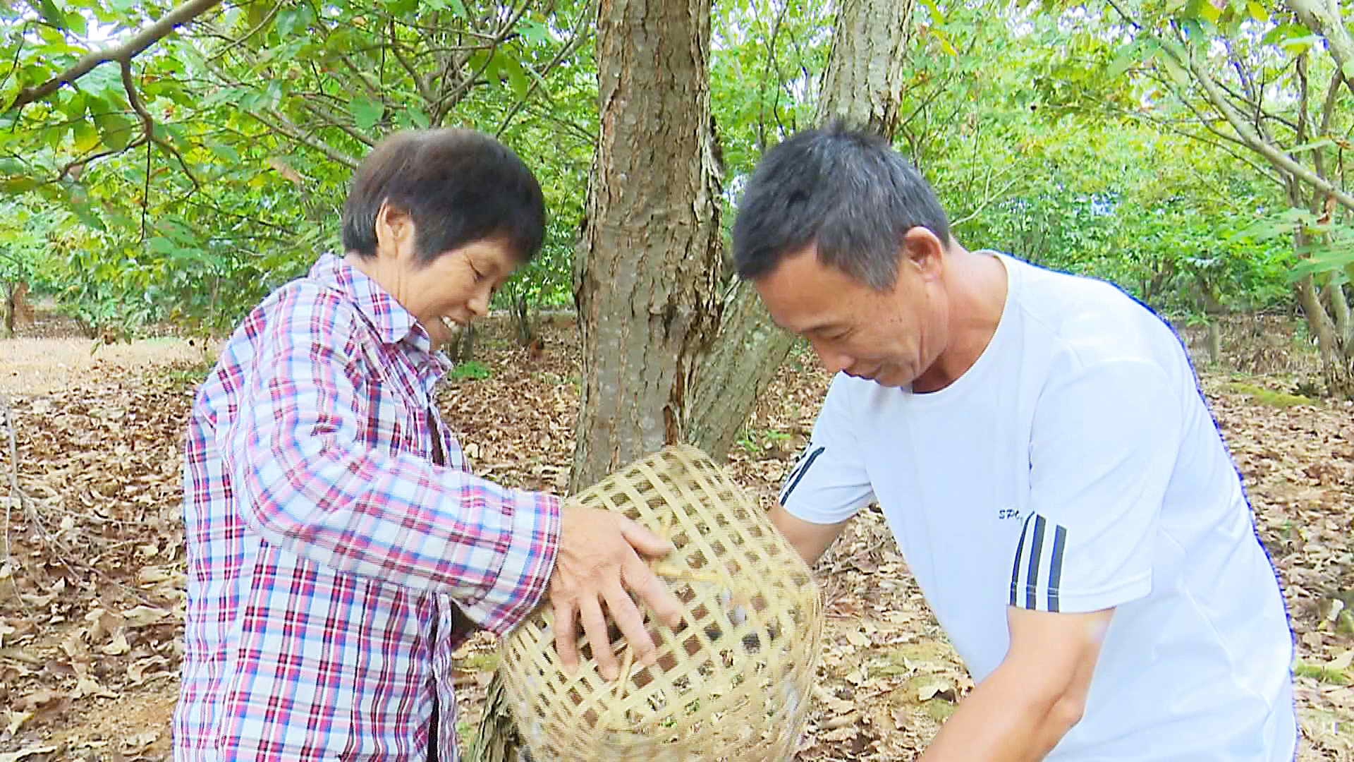 阳光透过栗叶间隙,洒落在一地开了口的板栗上,像照射着一张张笑脸。肖芬培和刘水凤夫妻俩头戴草帽,挎着麻布袋来到板栗林下,正有说有笑地分拣、包装着板栗,不时还有老客户亲自上门购买。