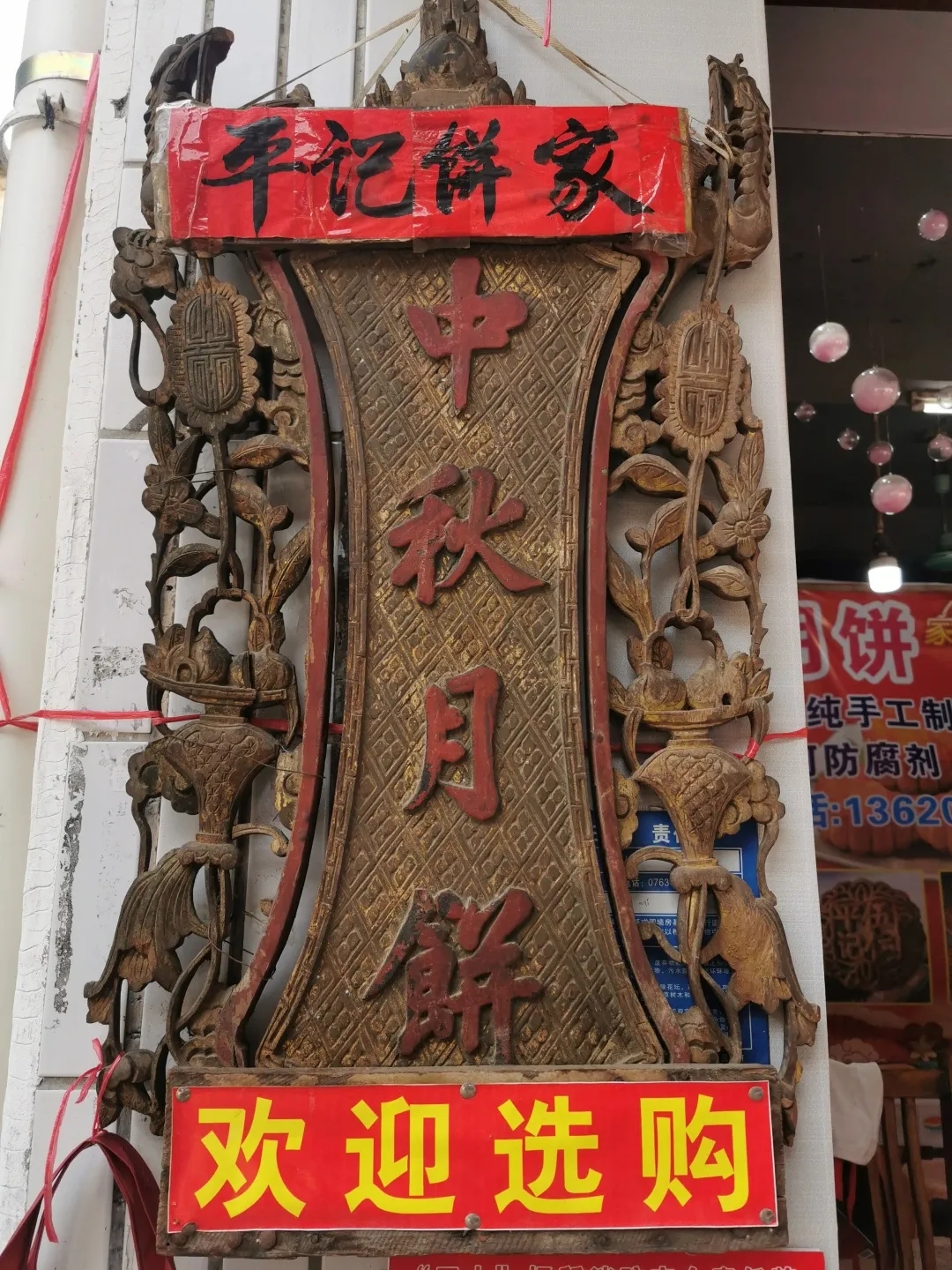 老字号的平记饼家其实是一间普通作坊民居,位于太平镇北闸街旧街,一楼是门店,二楼是作坊,临街档位挂着一块岁月痕迹的“中秋月饼”牌匾,镂刻着宝瓶花卉,古色古香,相传就是曾镜平的曾祖父传下来的,上面寓意富贵吉祥的雕刻和鎏金已经随着岁月流逝而显得模糊,但仍可透出百年饼家昔日的严谨风范。每年农历八月初一开始,曾镜平和一众师傅就会聚集在这里,进入为期大半个月的月饼制作期,传统手工所产的五仁,豆沙,蛋黄等月饼口碑相传,供不应求。