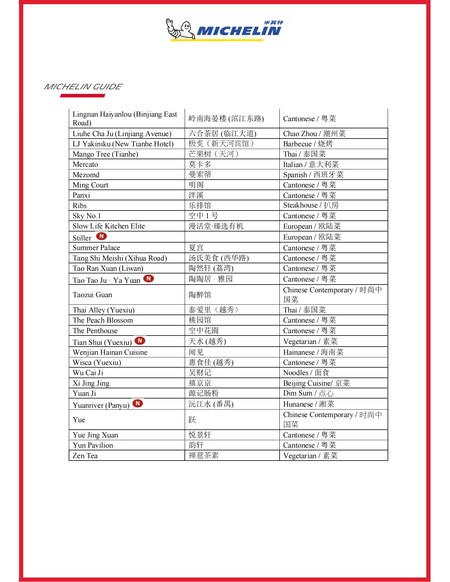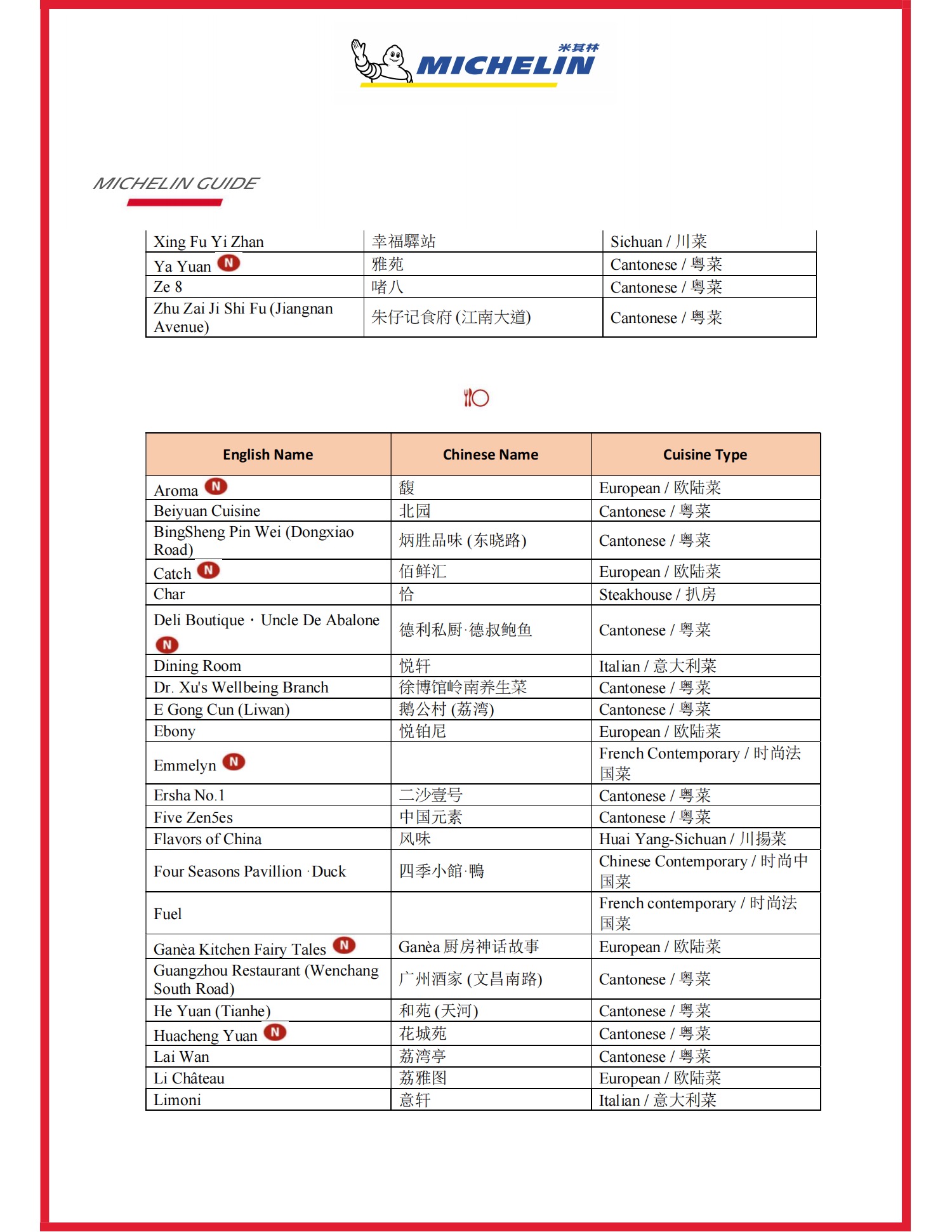 除星级餐厅、必比登推介餐厅外,还有54家餐厅获得推荐,涵盖近20种中外地区菜系,也是食材新鲜、菜肴美味的代表,其中有10家新上榜餐厅,它们是馥、佰鲜汇、德利私厨·德叔鲍鱼、Emmelyn、Ganèa Kitchen Fairy Tales、花城苑、Stiller、陶陶居 · 雅园、天水 (越秀),以及沅江水 (番禺)。
