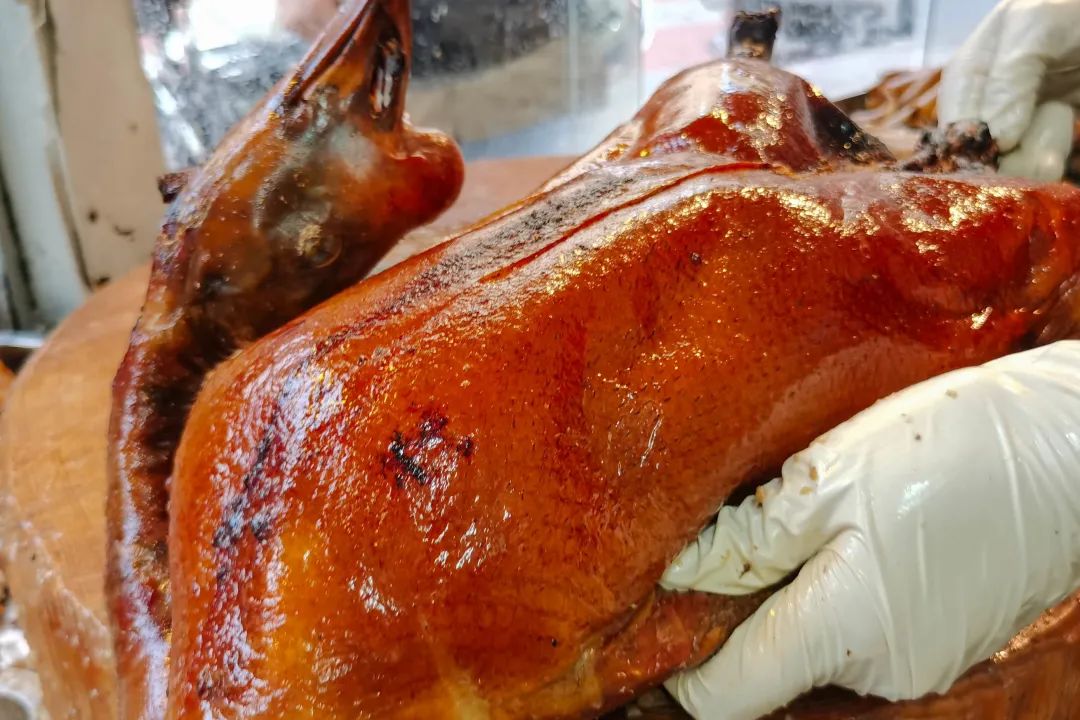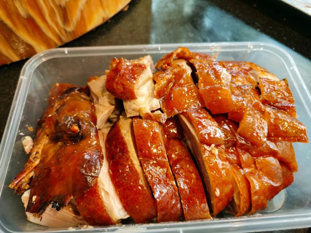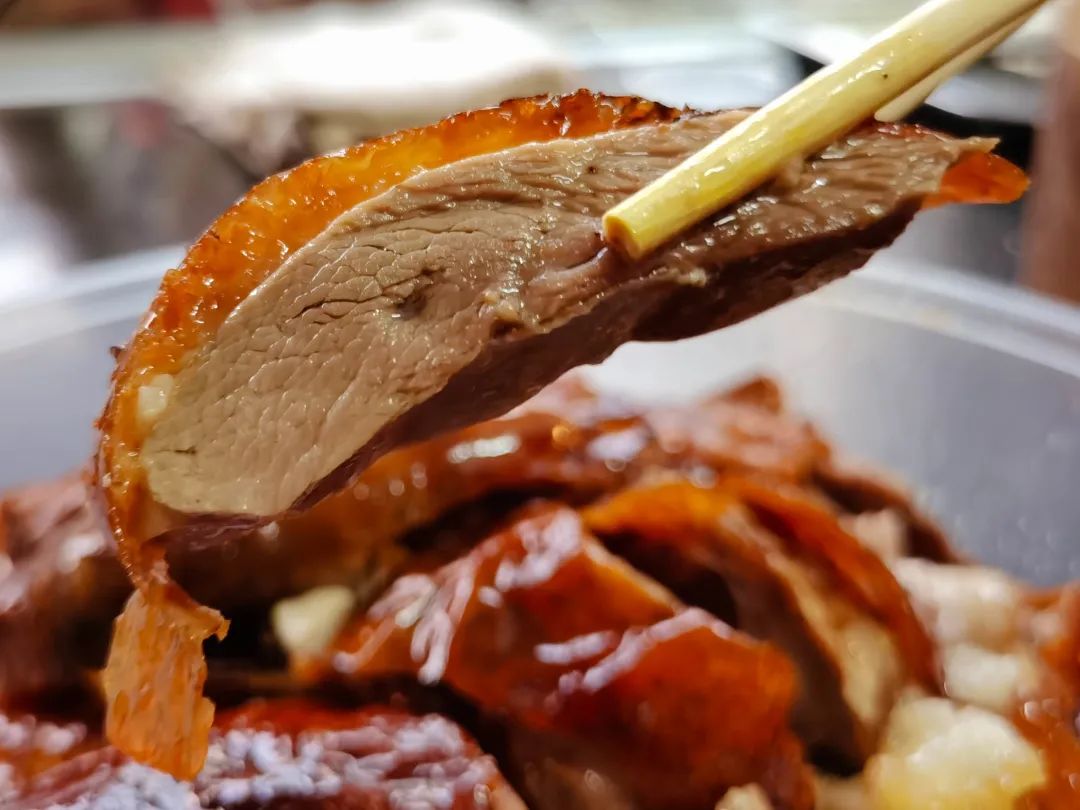 正吊烧鹅平时吃得多,倒挂烧鹅就没那么容易能吃上,它的制作工序比正吊烧鹅更复杂,通常需要提前一天预约才可以。遇上中秋节,街坊甚至买一桩正吊烧鹅也可能需要排队排到对面马路,更别说想轻易买到一只令人垂涎的倒挂烧鹅。
