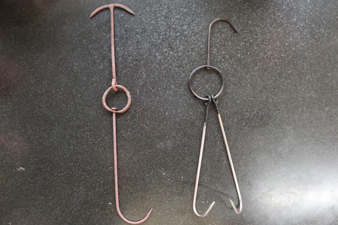 那么与普通烧鹅相比,倒挂烧鹅的制作有什么不同?倒挂烧鹅需要用到特制的挂钩,这种特制挂钩底部只有一个尖利挂钩,通过底部挂钩穿入鹅的臀部、勾住鹅的脊骨,将鹅稳稳地倒挂起来。
