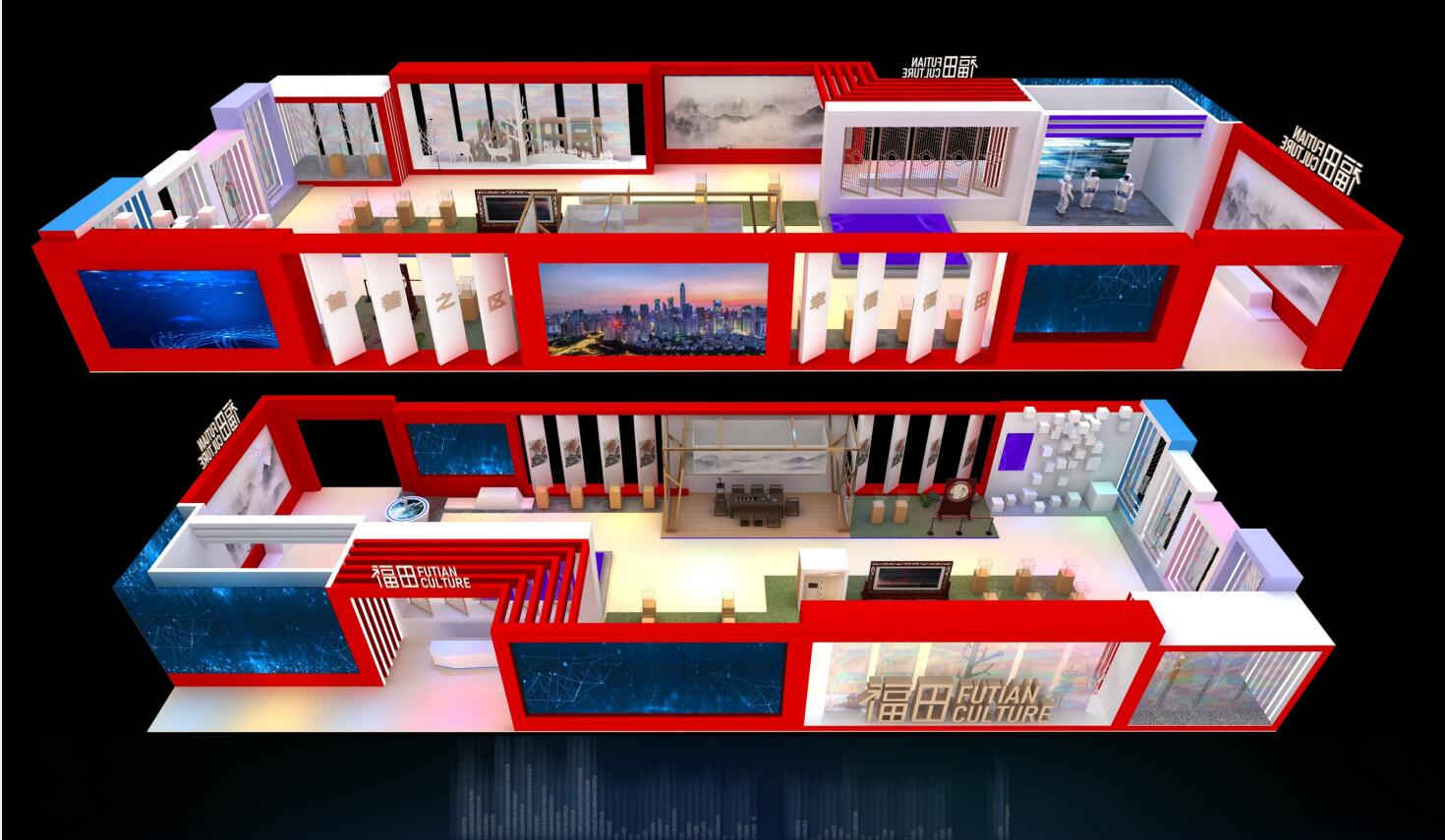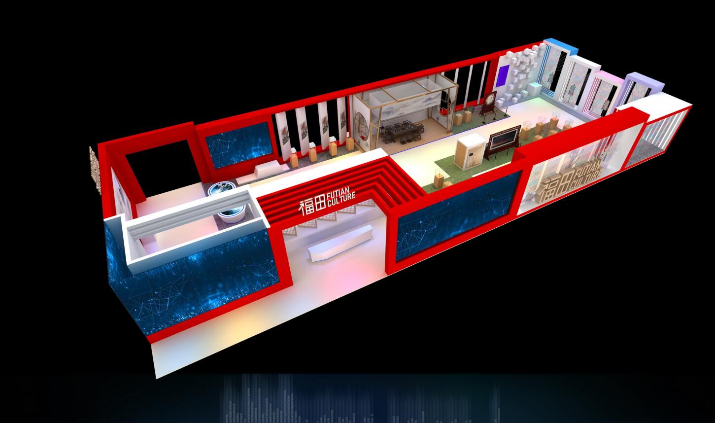 (福田主展馆设计效果图)叹为观止的中国工艺美术大师“匠心菁华”,难得一见的东方国宝,蔚为大观的非遗产业创新杰作;精彩呈现福田时尚30年,“时尚橱窗”“创演空间”多重演绎,福田装饰设计带您领略城市艺术;空气成像与工艺美术大师完美融合,裸眼3D、全新穿搭体验——3D人体测量仪……将在福田区主会场一展风采。