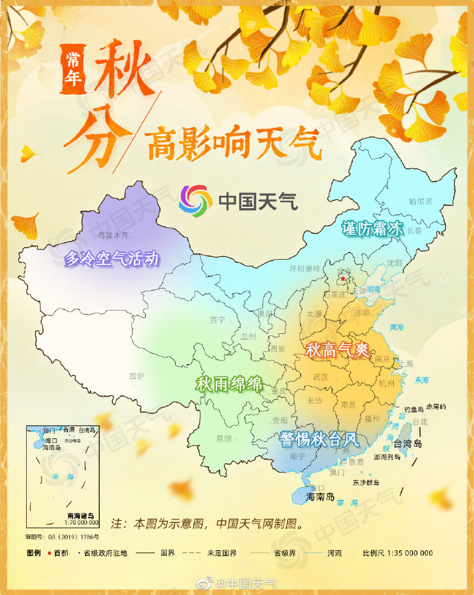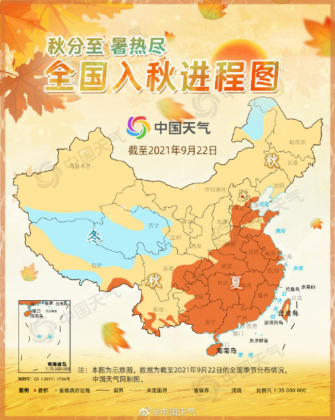 今天(9月23日)3时21分进入秋分节气,秋分节气期间,随着太阳直射点逐渐向南移动,北半球白昼越来越短,气温逐日下降,我国秋季版图也将达到鼎盛。中国天气网特别推出最新入秋进程图,看看你家步入真正的秋天了吗?秋分节气期间又有哪些高影响天气?