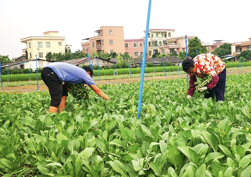 水稻田里,禾苗长势茂盛;菜地里,番薯藤、菜心等叶菜翠绿长势喜人,村民们在采摘蔬菜,有的在种植蔬菜……