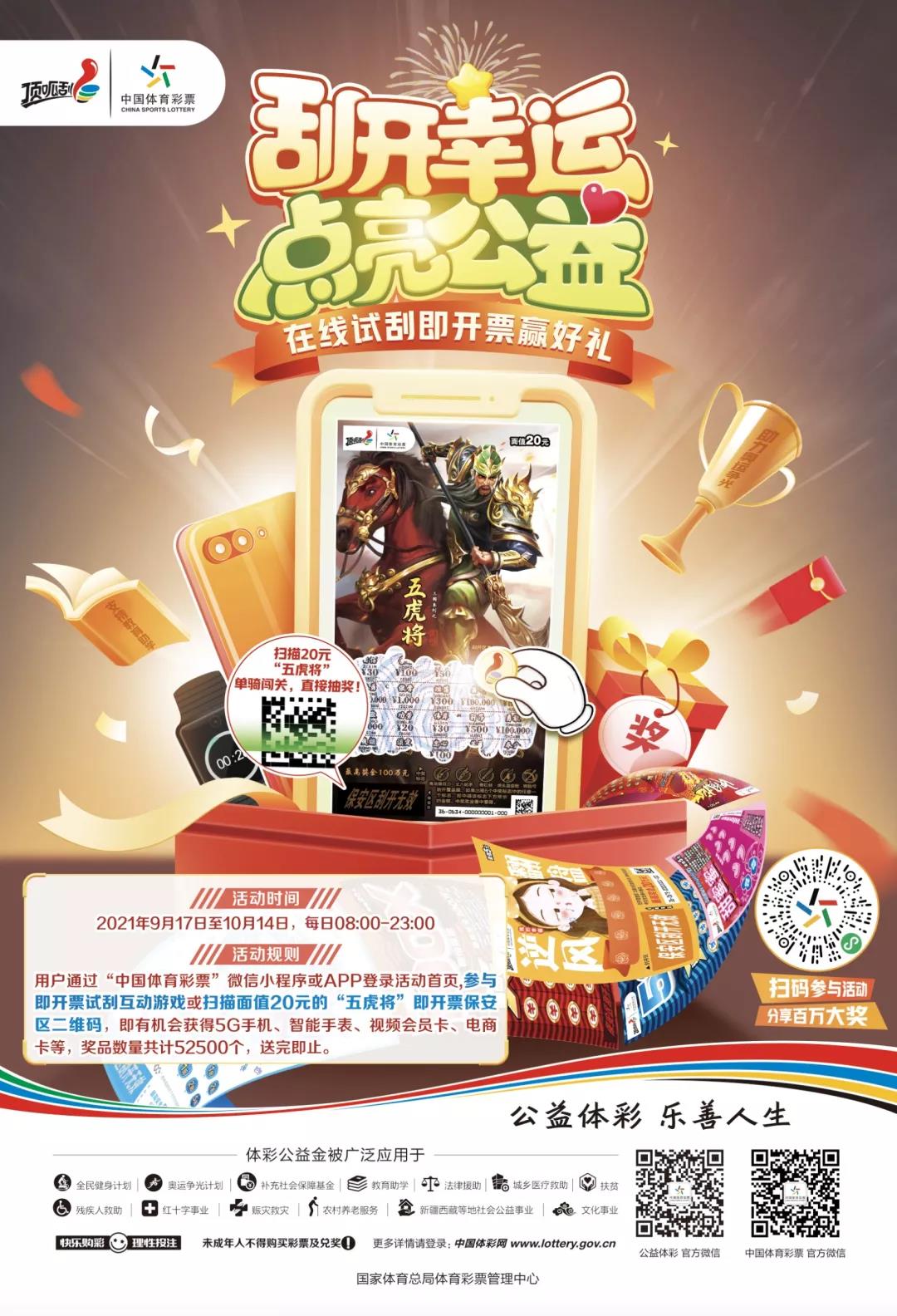 超级大乐透火爆当然要投注,但现在不花钱也有机会收到体彩的礼物。刮开幸运,点亮公益!体彩即开票试刮活动火热进行中!参与即开票试刮互动游戏或扫描面值20元的“五虎将”即开票保安区二维码,就有机会赢取5G手机、智能手表等惊喜好礼!