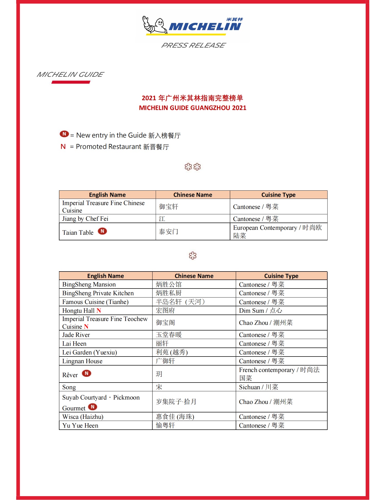 9月22日,米其林正式发布2021年广州指南完整榜单,包括星级名单、必比登推介榜单、米其林餐盘完整名单,以及米其林服务奖和年轻厨师奖两个特别奖项。三星今年依然从缺。