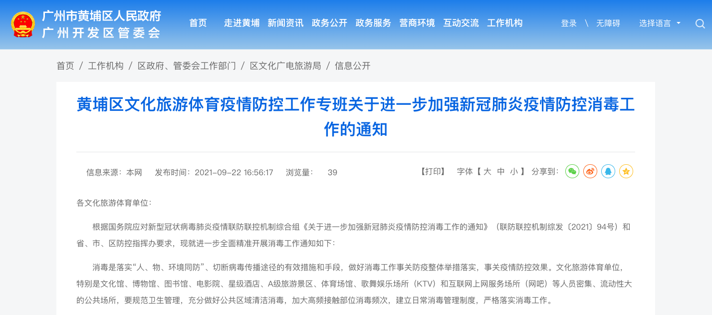 9月22日,广州市黄埔区发布了关于文化旅游体育疫情防控工作专班关于进一步加强新冠肺炎疫情防控消毒工作的通知。