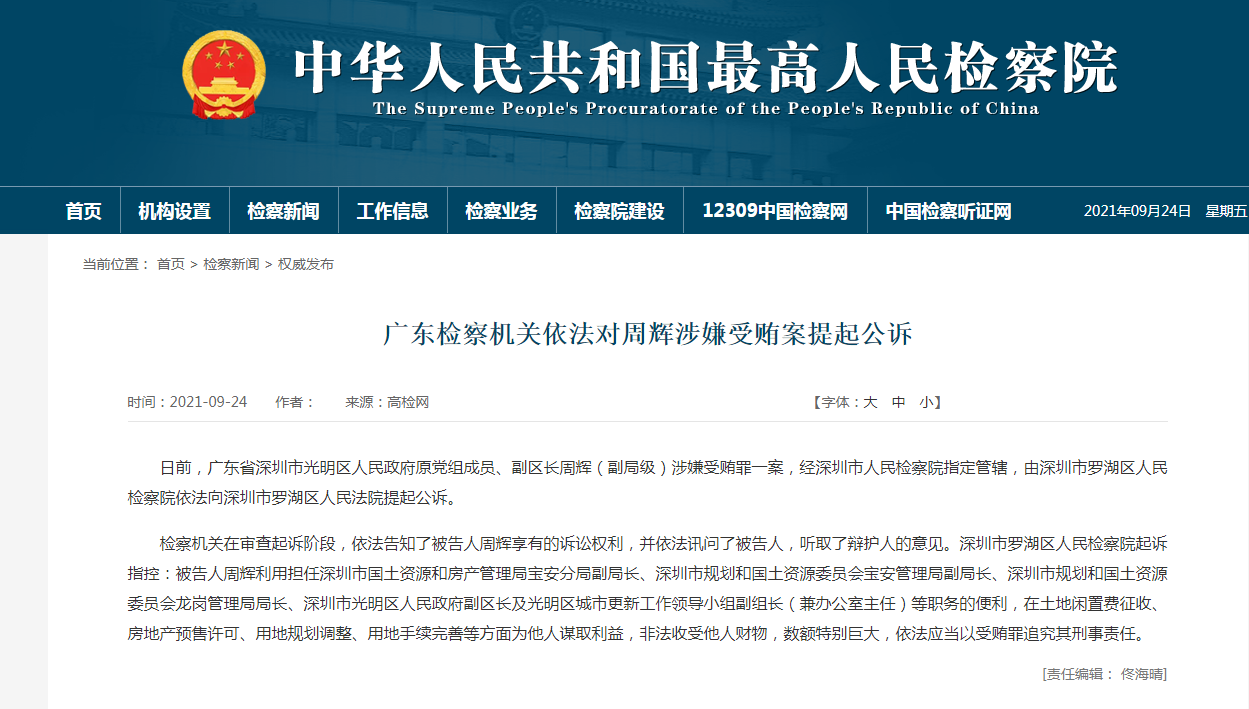 日前,广东省深圳市光明区人民政府原党组成员、副区长周辉(副局级)涉嫌受贿罪一案,经深圳市人民检察院指定管辖,由深圳市罗湖区人民检察院依法向深圳市罗湖区人民法院提起公诉。