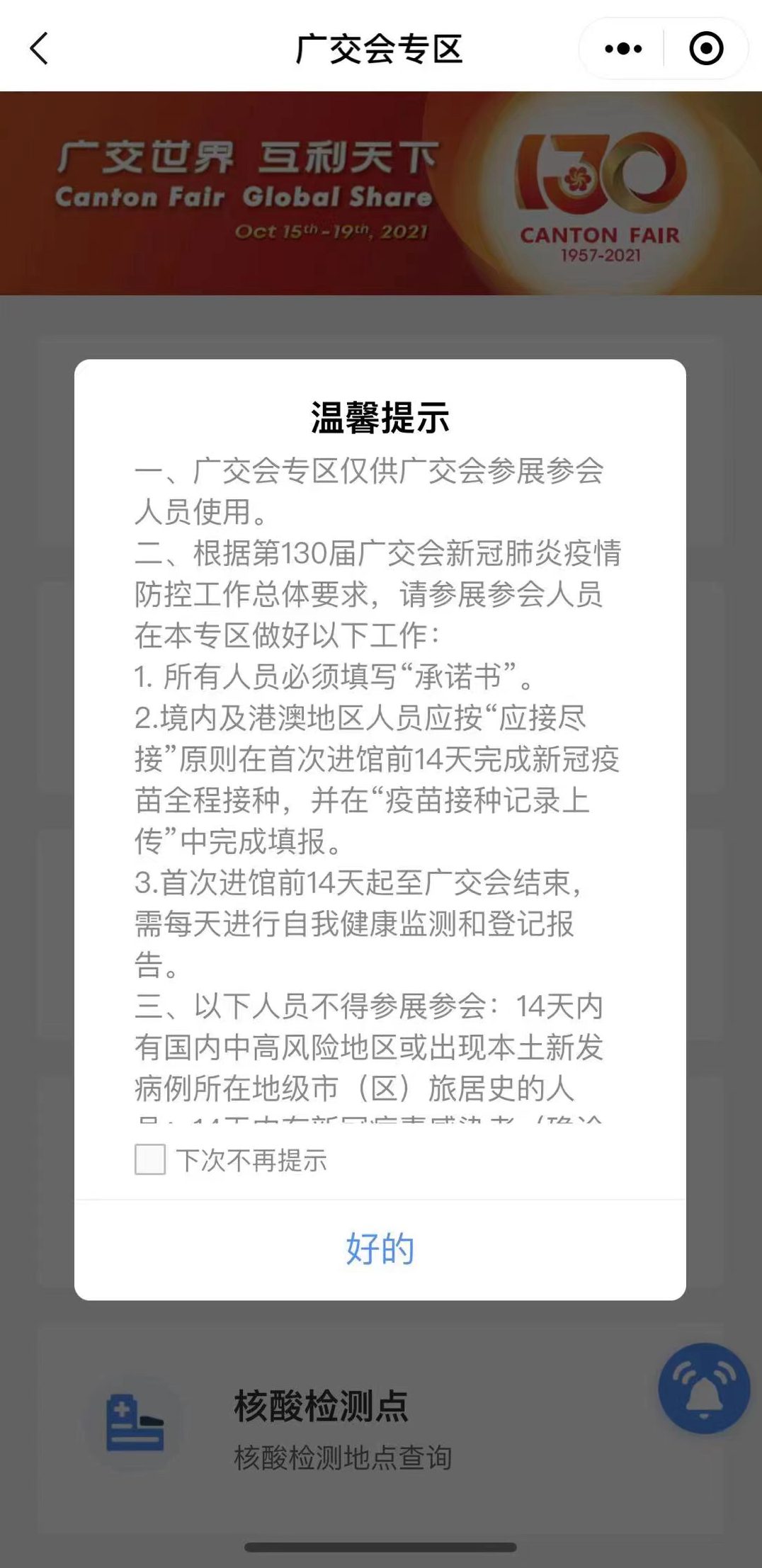 据悉,本届广交会所有参展参会人员均须提前登录“穗康”小程序,生成健康码,并在“穗康”小程序“广交会专区”主动申报登记个人相关防疫信息。领取大会证件前,须填报新冠疫苗全程接种情况和在粤居住地址,签署健康承诺书,并在进馆前主动填报14天的自我健康监测和登记。本届广交会将健康码数据与广交会证件数据实时对接,实现“证码互通”。