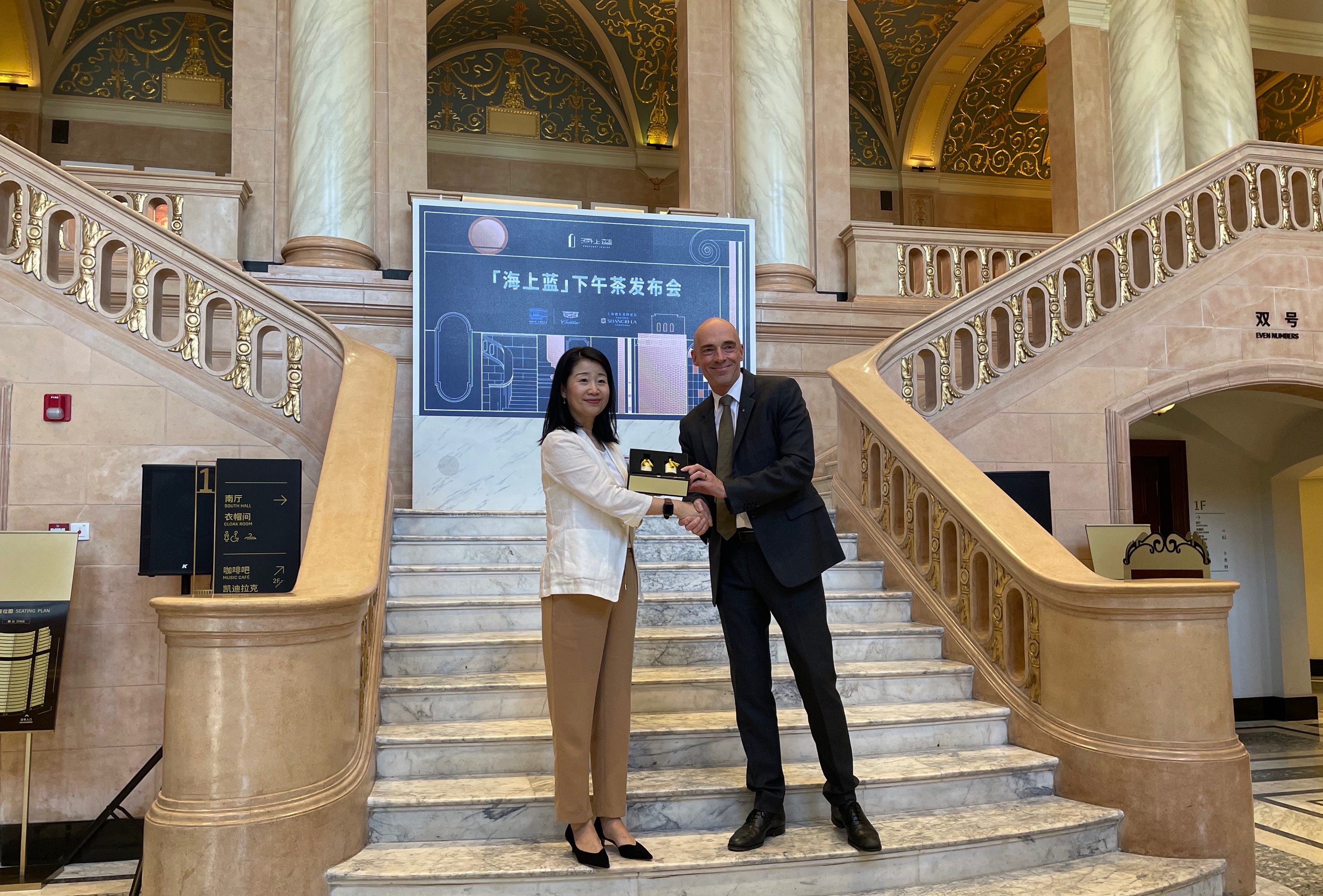 伴随着动人的音乐缓缓响起,“海上蓝”下午茶发布会正式开启。据介绍,该下午茶套餐是上海音乐厅携手合作伙伴——上海浦东香格里拉,以音乐厅“海上蓝”穹顶建筑元素和音乐主题为设计灵感,创作而来。
