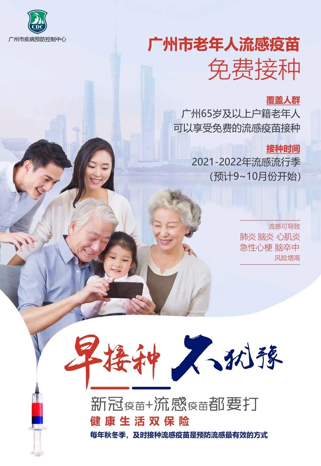【十件民生实事之一!广州启动老年人流感疫苗免费接种!】广州日报·新花城记者从市疾病预防控制中心了解到,广州市各区将于9月~10月陆续启动对具有本市户籍且年满65周岁及以上(即1957年4月1日前出生)的老年人实行免费接种。 详情>>>