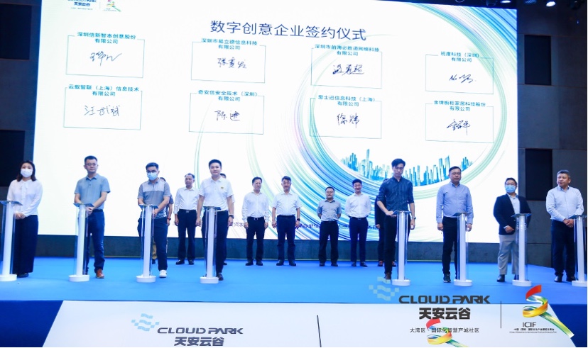 在现场各位嘉宾的见证下,班度科技(深圳)有限公司、深圳信新智本创意股份有限公司、深圳市易立德信息科技有限公司等8家来自不同细分领域的数字创意企业代表上台签约,与天安云谷建立生态合作伙伴关系,共同促进文化创意行业的繁荣发展。