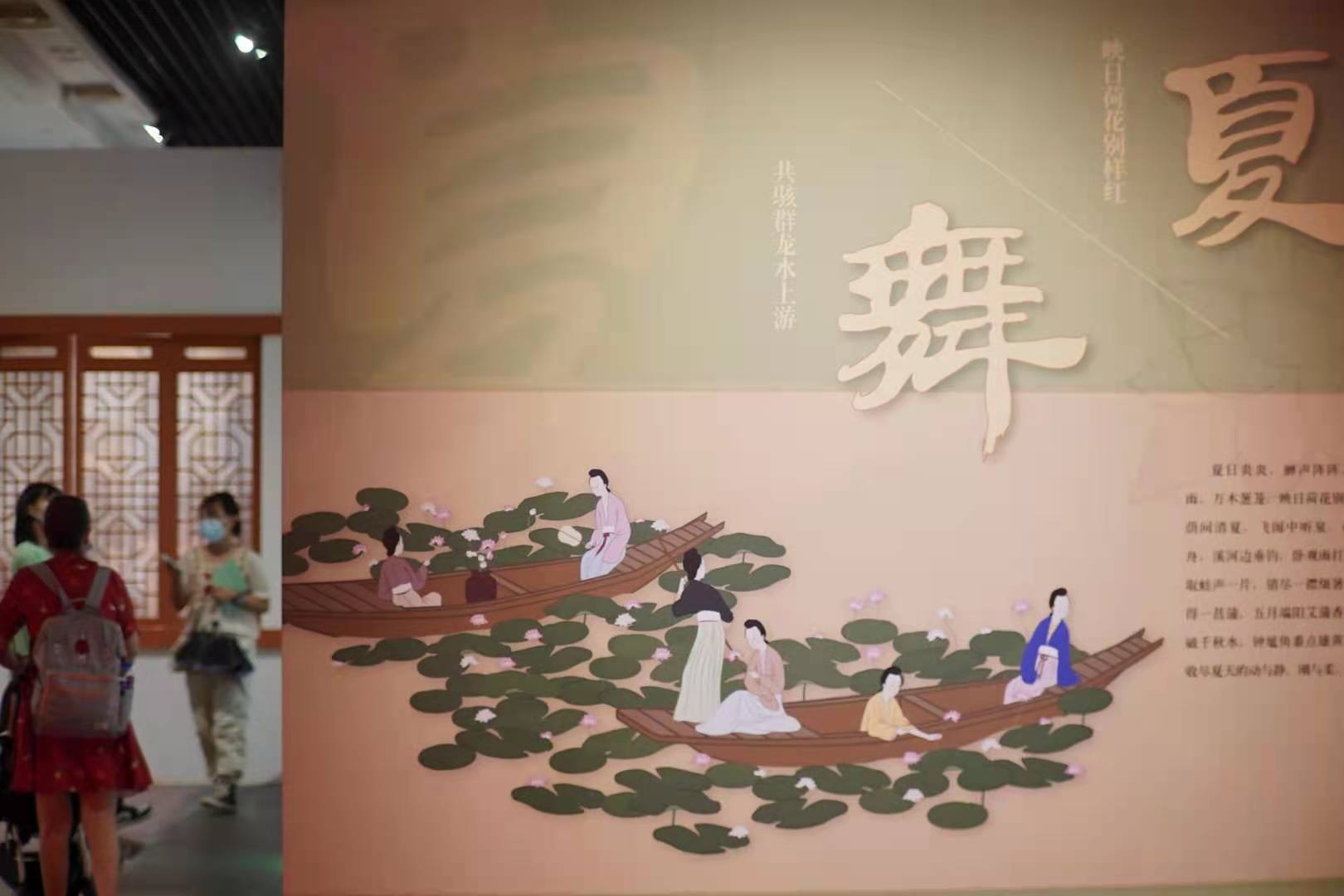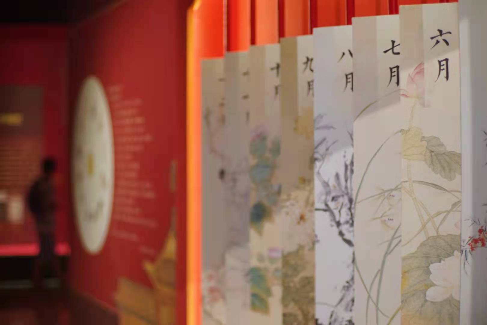 展览共分为四个部分。第一部分“春萌”,通过一系列展品,向观众展示生机勃勃的“春景”和人们在佳节中对新的一年美好生活的向往与追求。第二部分“夏舞”,展示了从松荫间消夏、飞阁中听泉、荷塘里泛舟、溪河边垂钓,到四月菖蒲庆生,五月龙舟竞渡,钟馗角黍点雄黄的应时画作,突出夏日里的动与静、刚与柔。第三部分“秋兴”,展示了层林尽染、蟹肥菊黄、五谷丰登、瓜果飘香的秋日丰收之景,亦有落木萧萧、雁过留声的淡淡忧伤,更有圆月下、高山上浓浓的思念之情。第四部分“冬藏”,是本次展览打造的互动重点。在这里,画中有冬日古人策杖寻梅的身影,画外有特别设计的九九消寒图互动。
