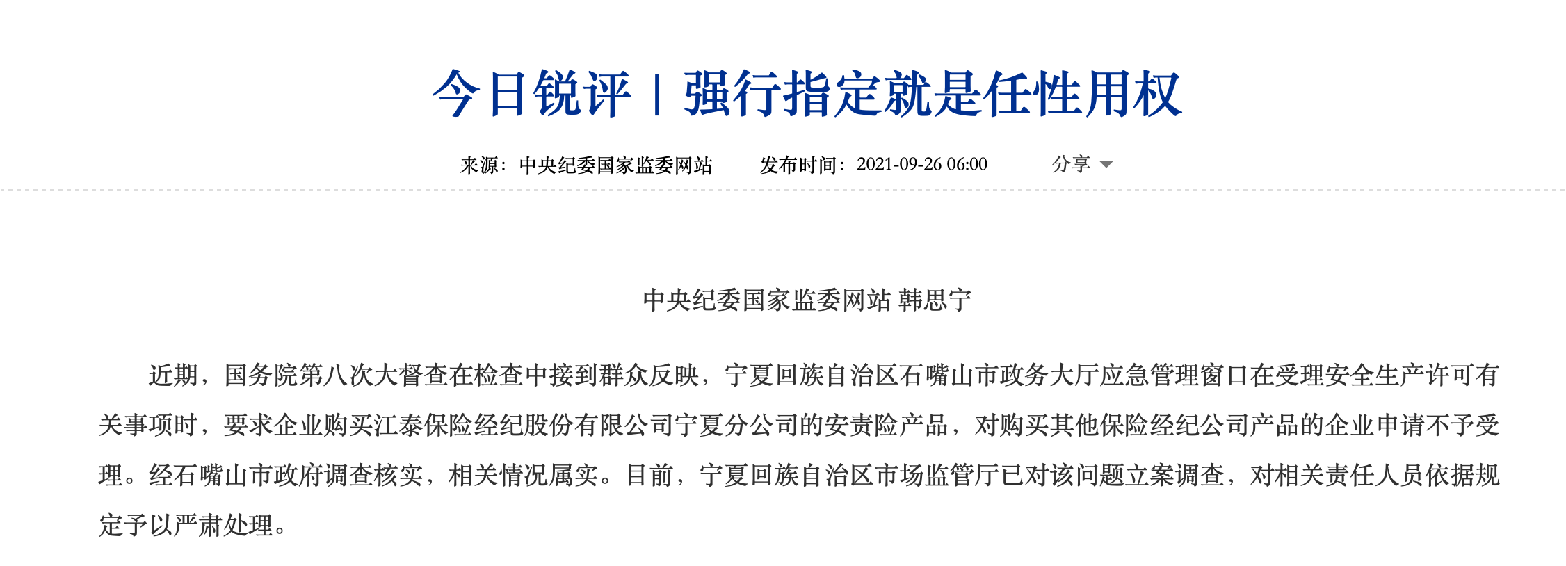 近期,国务院第八次大督查在检查中接到群众反映,宁夏回族自治区石嘴山市政务大厅应急管理窗口在受理安全生产许可有关事项时,要求企业购买江泰保险经纪股份有限公司宁夏分公司的安责险产品,对购买其他保险经纪公司产品的企业申请不予受理。经石嘴山市政府调查核实,相关情况属实。目前,宁夏回族自治区市场监管厅已对该问题立案调查,对相关责任人员依据规定予以严肃处理。