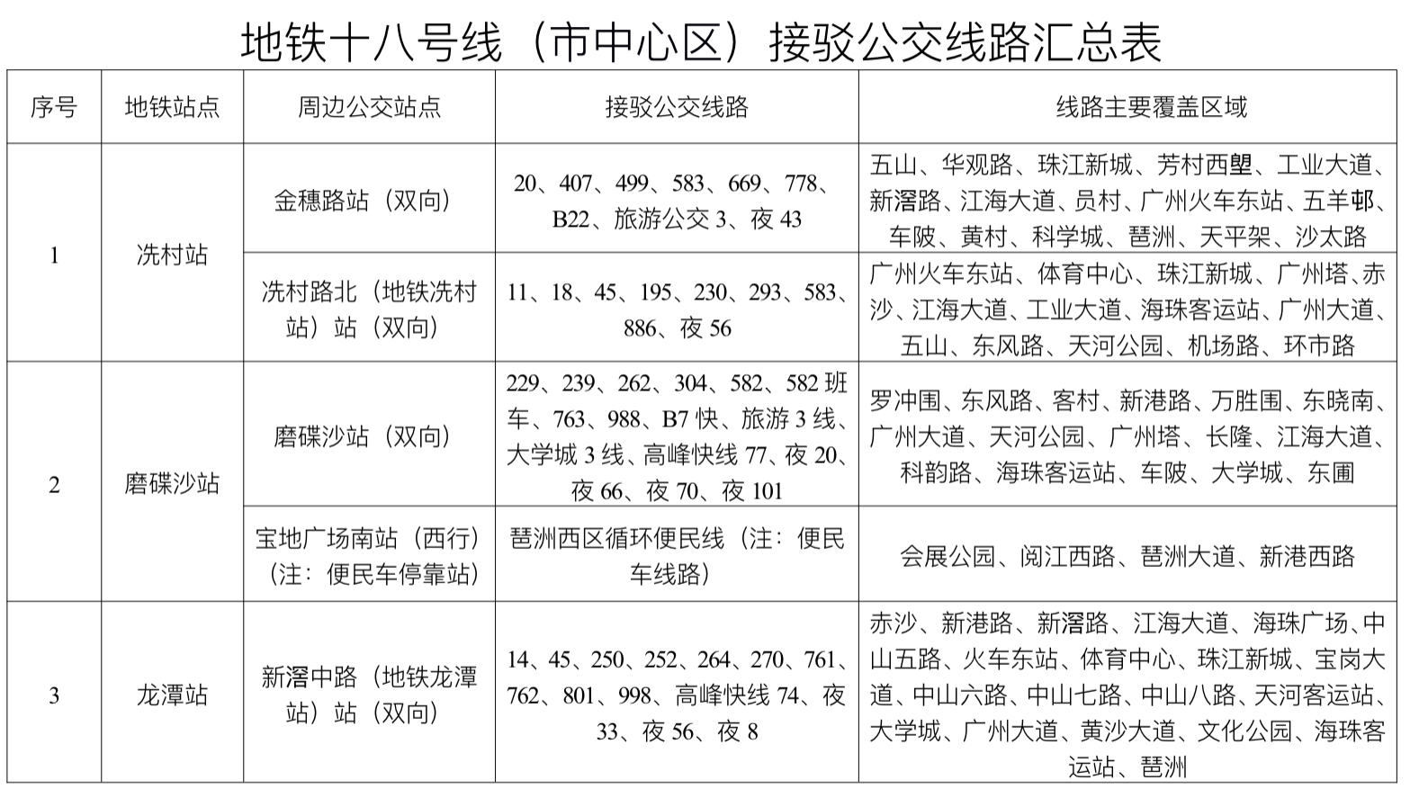 广州地铁十八号线首通段(万顷沙站至冼村站)计划于9月28日14时起开通运营,届时将实现南沙副中心至广州中心城区的轨道交通联络。地铁十八号线在广州市区中心设有龙潭站、磨碟沙站和冼村站,其中龙潭站和冼村站为新增地铁站点。记者从广州市交通运输部门了解到,针对上述新增的地铁站点,结合周边公交线路和站点的分布,广州市交通运输部门对相关公交站点和线路进行了优化,为地铁十八号线开通同步提供完善的公交接驳服务: