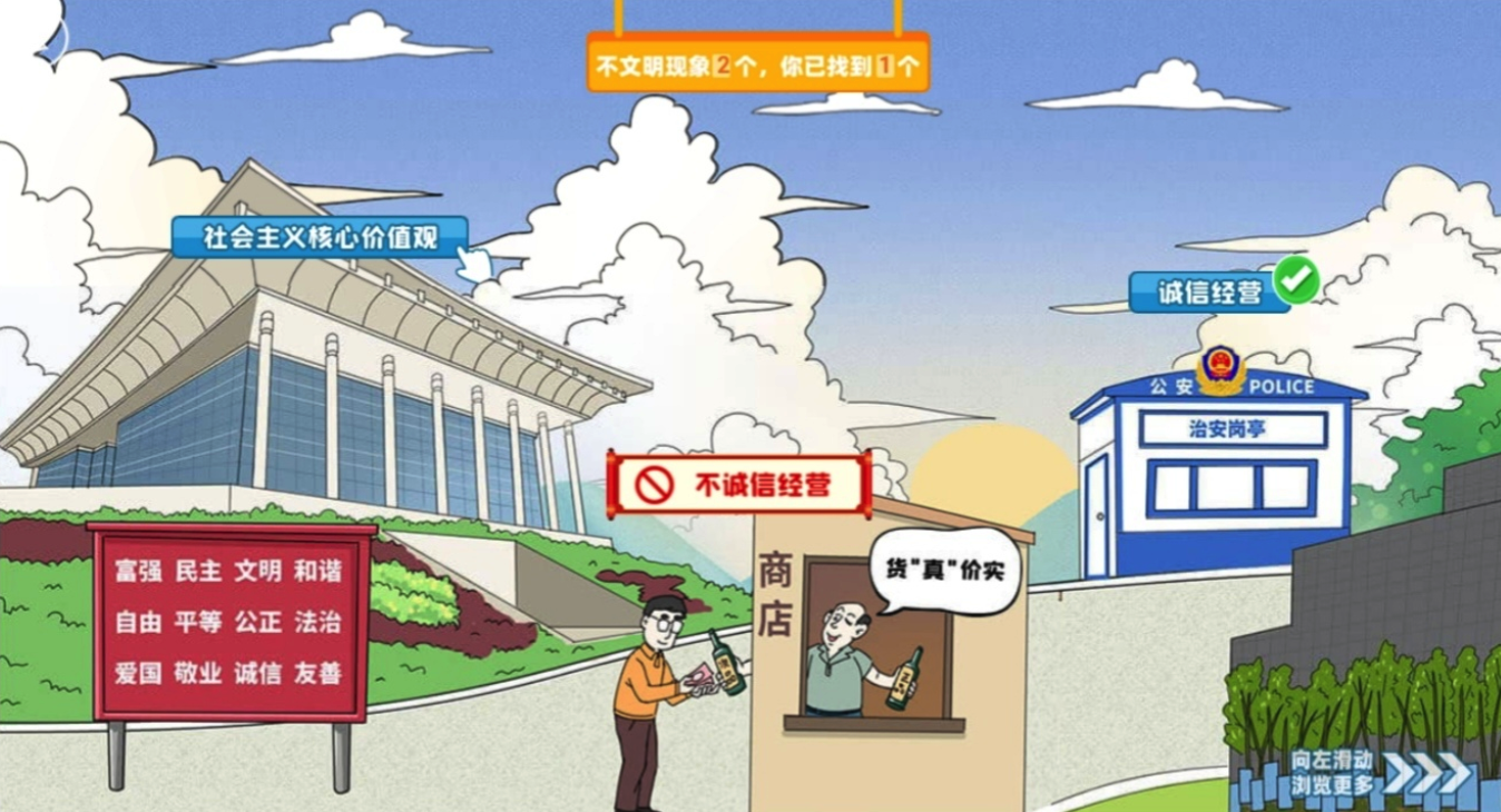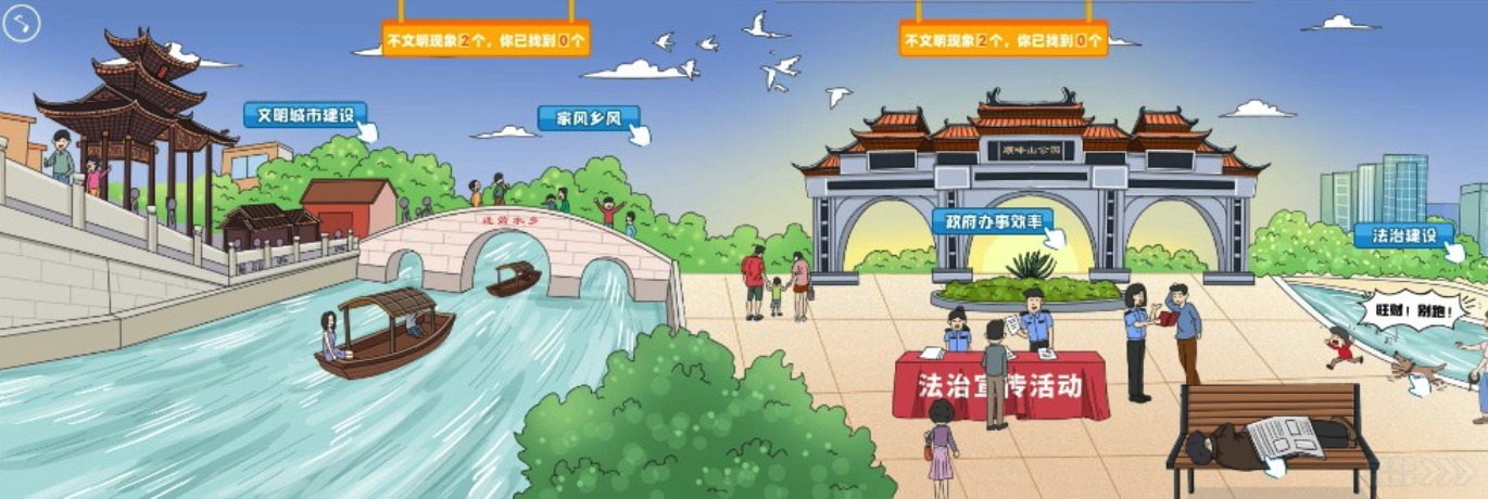 在H5页面中,市民化身文明达人,运用智慧和文明知识,开启“火眼金睛”,从中找出不文明行为,实现闯关;若遇到不会作答的题目,只要点击旁边的提示观看文明知识普及,便可找到答案;完成闯关后还可获得奖励机会,邀请朋友加入闯关奖励机会翻倍。