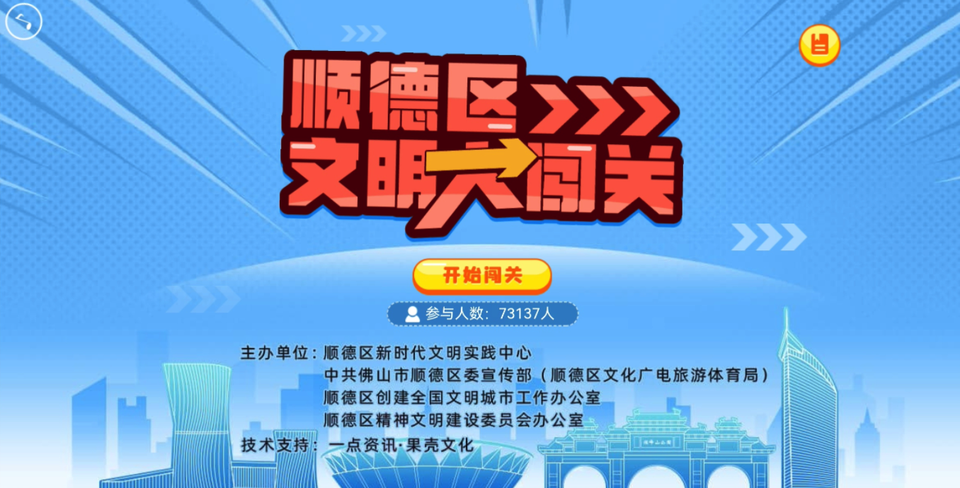 2020年,佛山市第三次奋夺全国文明城市的荣誉称号;今年,佛山在朝第四次夺得全国文明城市荣誉奋进的同时更提出要创建更好层次、更高水平的“全国文明典范城市”。作为全国新时代文明实践中心试点、全国高质量发展和综合实力百强区之冠,顺德坚定不移地贯彻新发展理念,牢固树立“文明创建永无止境”理念,在思想层面把提升城乡品质、实施乡村振兴战略、“我为群众办实事”实践活动等结合起来,在具体操作层面加强创文动态化管理水平,在营造创文氛围方面特别推出线上创文闯关H5。这一H5由顺德区新时代文明实践中心、顺德区委宣传部(区文化广电旅游体育局)、区创建办、区文明办主办。