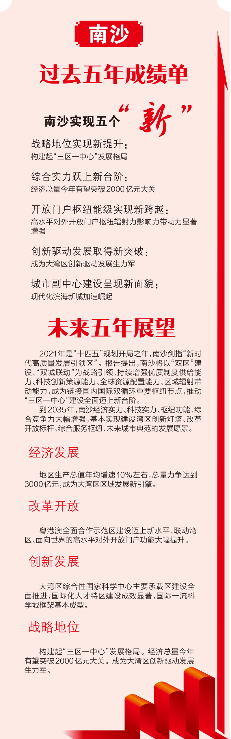 报告指出,南沙将牢牢把握“双区”建设、“双城联动”重大历史机遇,强化与横琴、前海战略互动,着力深化与港澳合作,推动大湾区建设走深走实,服务港澳融入国家发展大局。