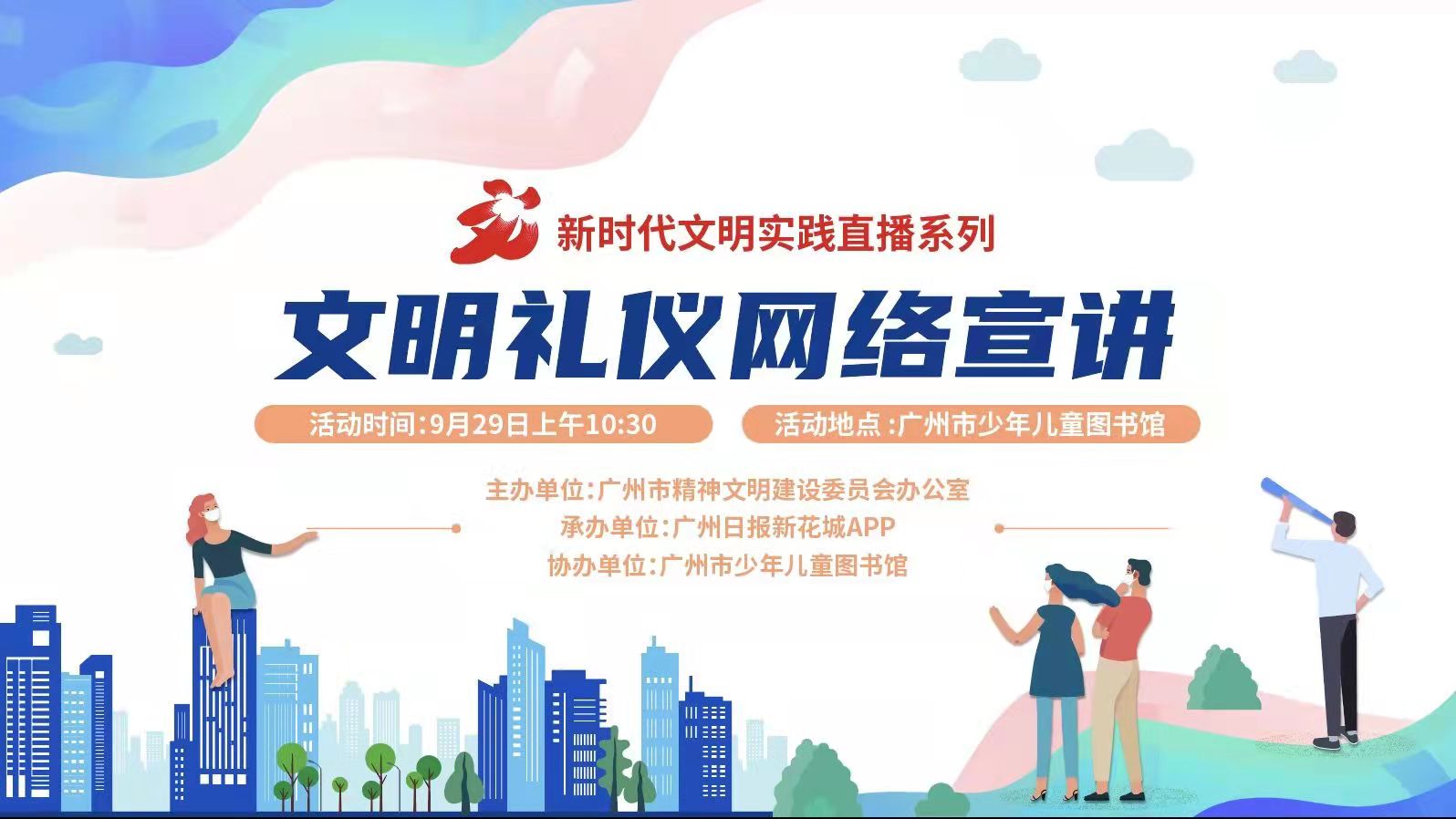 从古至今,“礼仪”几乎是每个中国人的必修课,重视礼仪更让中国赢得了“礼仪之邦”的美誉。新时代、新要求,在今天,我们又该如何上好“礼仪”这一课呢?为响应《广州市文明行动促进条例》实施一周年的号召,广州市精神文明建设委员会办公室主办的新时代文明实践直播系列之文明礼仪网络宣讲活动将于9月29日上午10:30在广州少年儿童图书馆举行。