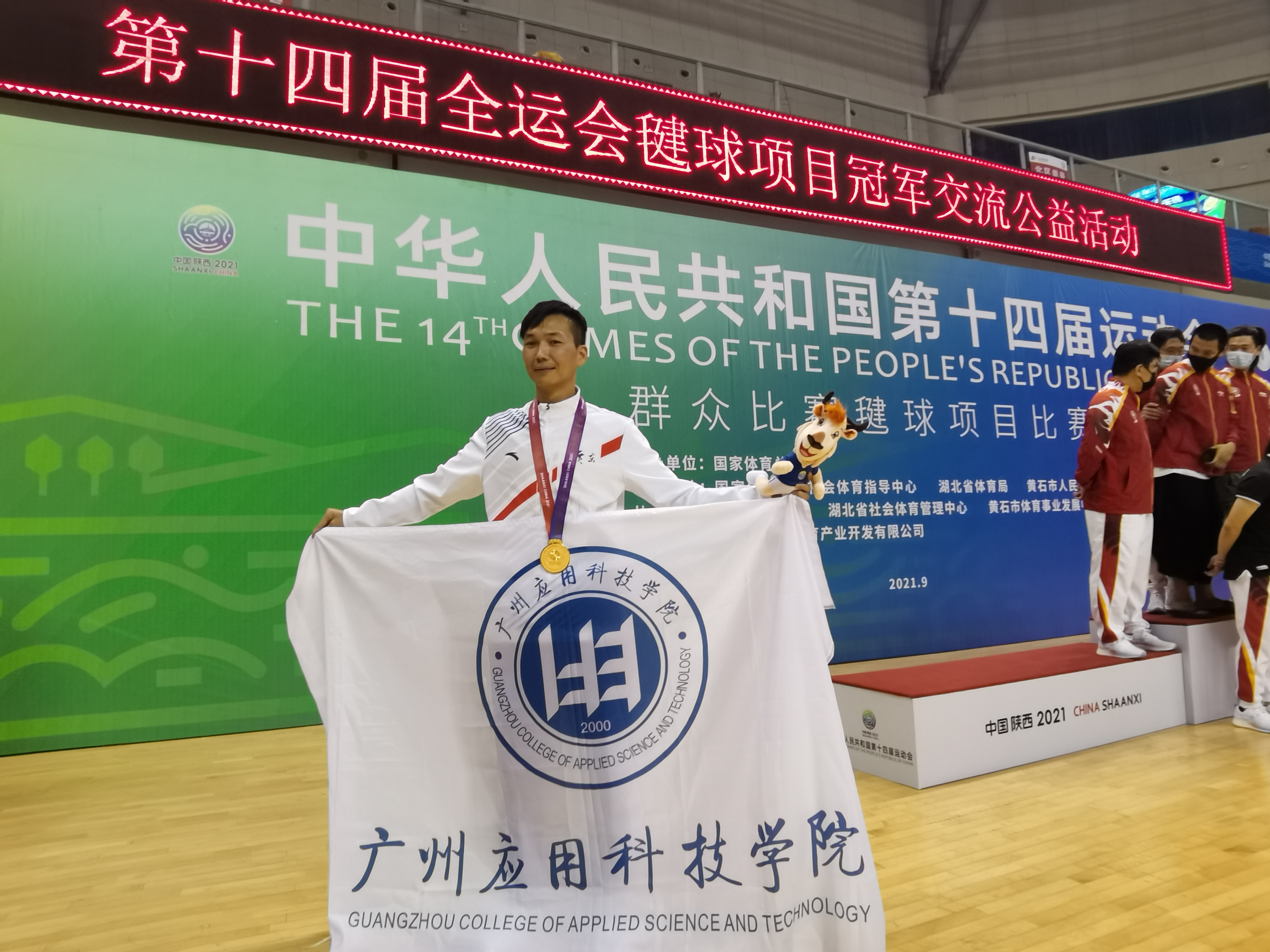 9月24日至9月27日,第十四届全国运动会举行毽球比赛。在9月27日下午的压轴赛事中,广州应用科技学院体育科技学院教师高浩光代表广东毽球队参赛,在毽球比赛男子三人组(青年组)的决赛中,以2比0的比分战胜湖北队夺得冠军,为广东代表团获得一枚金牌。