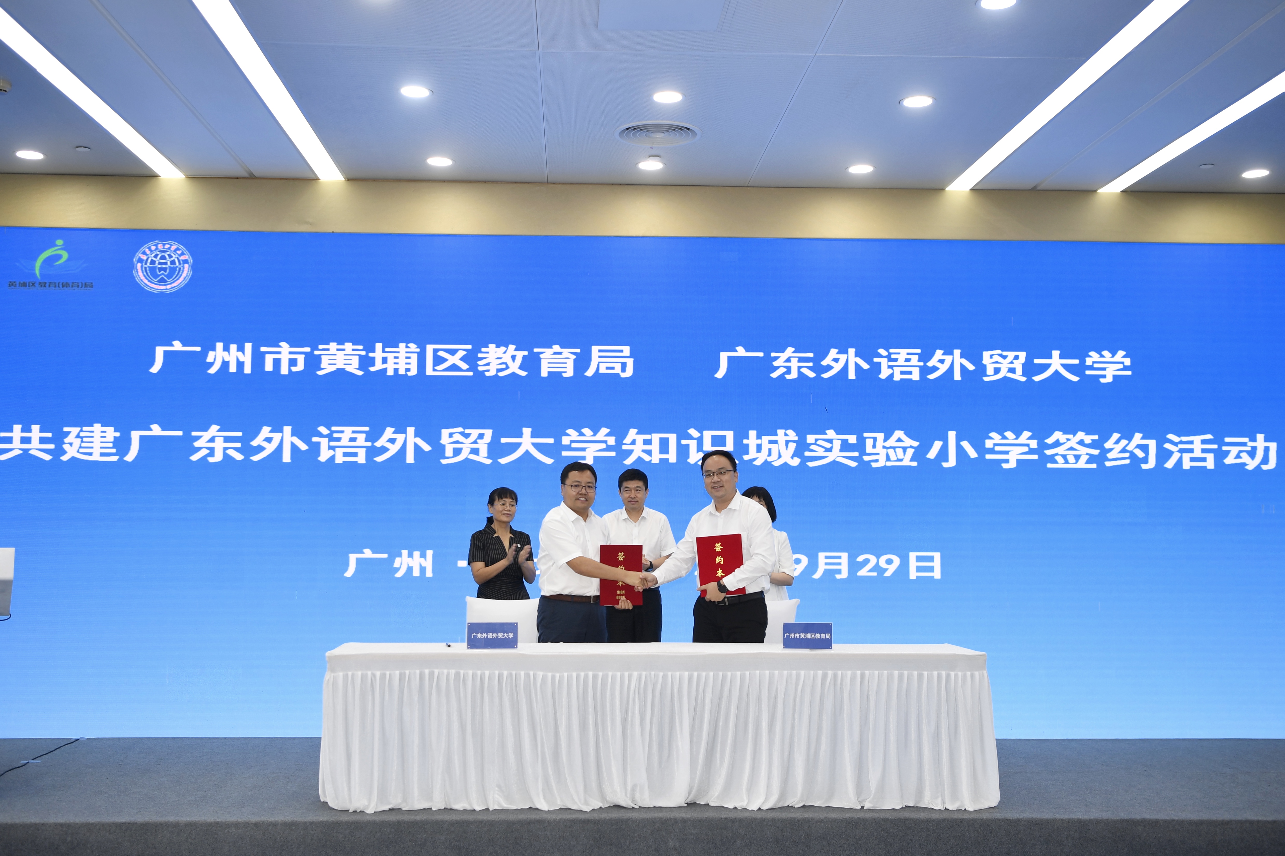9月29日,广州市黄埔区与广东外语外贸大学在广州科学城会议中心签订合作办学协议,这标志着广州中新知识城九龙新城首期安置房的配套小学——“广东外语外贸大学知识城实验小学(拟命名)”正式亮相。签约之后,广东外语外贸大学副校长王廷惠还向创校管理团队相关同志授校徽。