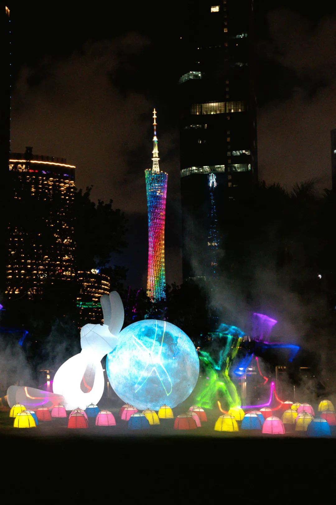 通过多媒体激光投影、彩光艺术灯、发光彩帐篷等