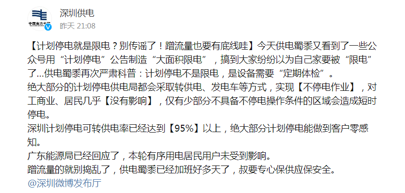关于相关问题,深圳供电局回应称:计划停电不是限电,是设备需要“定期体检”。绝大部分的计划停电供电局都会采取转供电、发电车等方式,实现【不停电作业】,对工商业、居民几乎【没有影响】,仅有少部分不具备不停电操作条件的区域会造成短时停电。