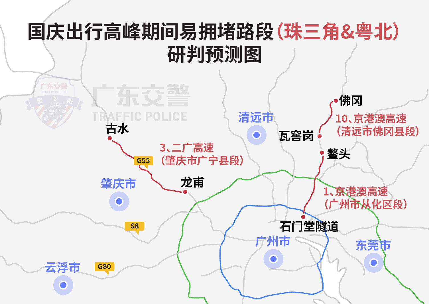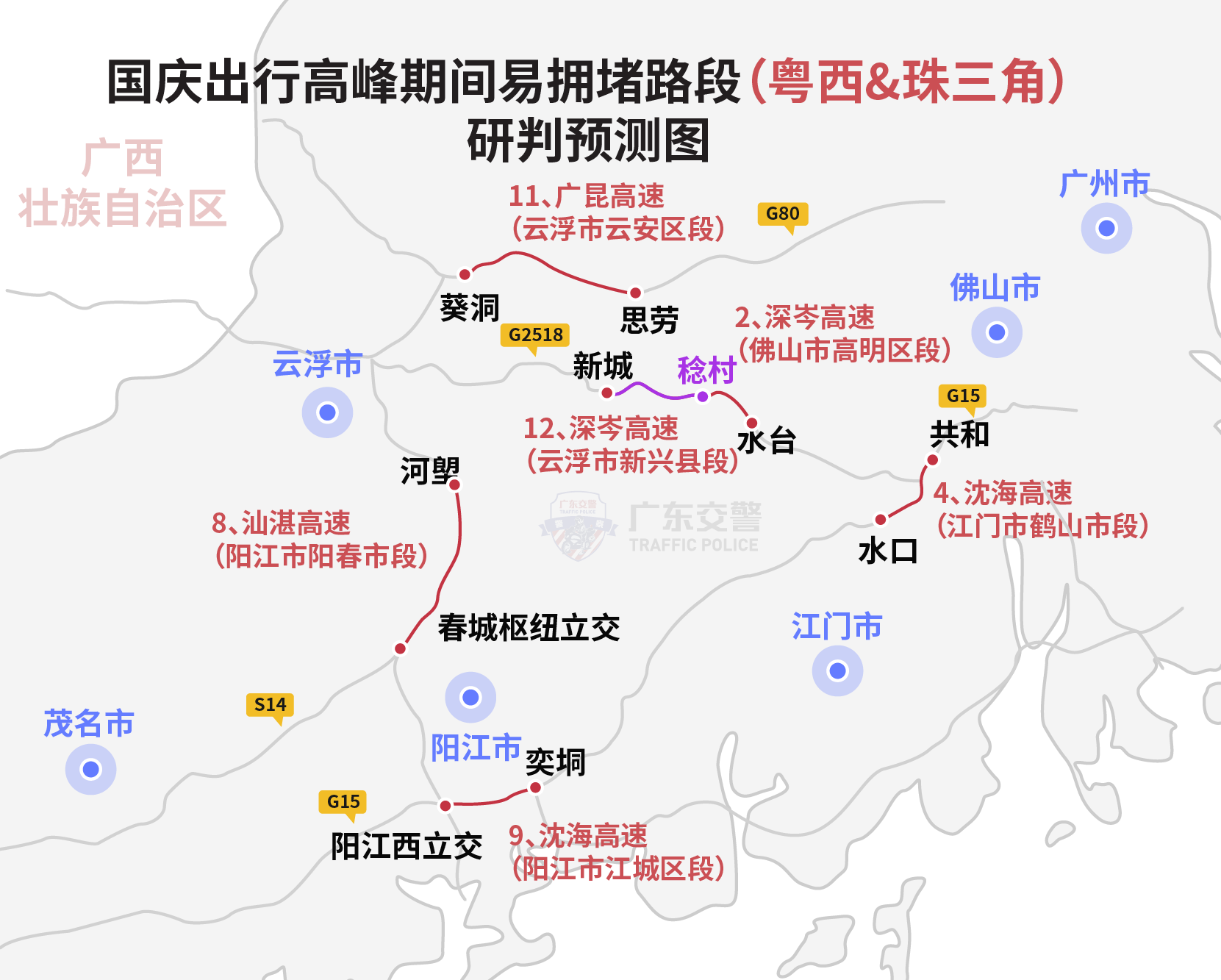 出程高峰期间易拥堵路段主要有:京港澳高速(广州市从化区段)、深岑高速(佛山市高明区段)、二广高速(肇庆市广宁县段)、沈海高速(江门市鹤山市段)、甬莞高速(惠州市惠东县段)、沈海高速(汕尾市海丰县段)、济广高速(河源市紫金县段)、汕湛高速(阳江市阳春市段)、沈海高速(阳江市江城区段)、京港澳高速(清远市佛冈县段)、广昆高速(云浮市云安区段)、深岑高速(云浮市新兴县段)。