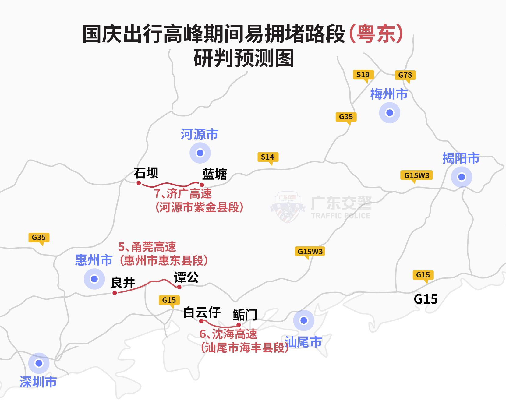 返程高峰期间易拥堵路段主要有:惠深沿海高速(深圳市盐田区段)、武深高速(韶关市仁化县段)、二广高速(肇庆市广宁县段)、广佛肇高速(肇庆市封开县段)、沈海高速(江门市新会区段)、汕湛高速(茂名市电白区段)、长深高速(惠州市惠阳区段)、济广高速(梅州市五华县段)、甬莞高速(汕尾市海丰县段)、沈海高速(汕尾市海丰县段)、汕湛高速(阳江市阳春市段)、许广高速(清远市清新区段)。