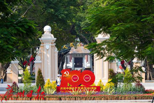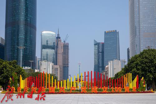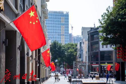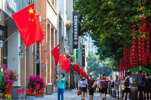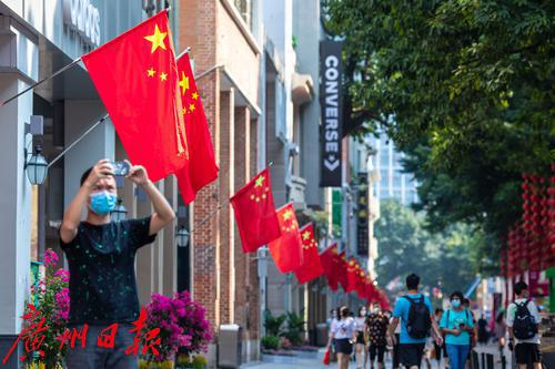 2021年9月30日,广州。国庆节即将到来,广州街头国庆的节日气氛渐浓。记者走访花城广场、北京路等景点,看到处处国旗飘扬、鲜花绽放,“中国红”已经成了广州街头的主色调。