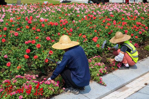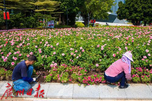 工人用鲜花悉心装扮花城广场。