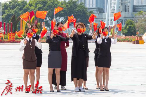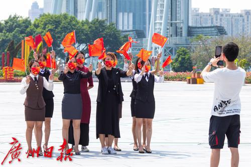 花城广场,有市民挥舞国旗拍摄国庆节祝福的视频。