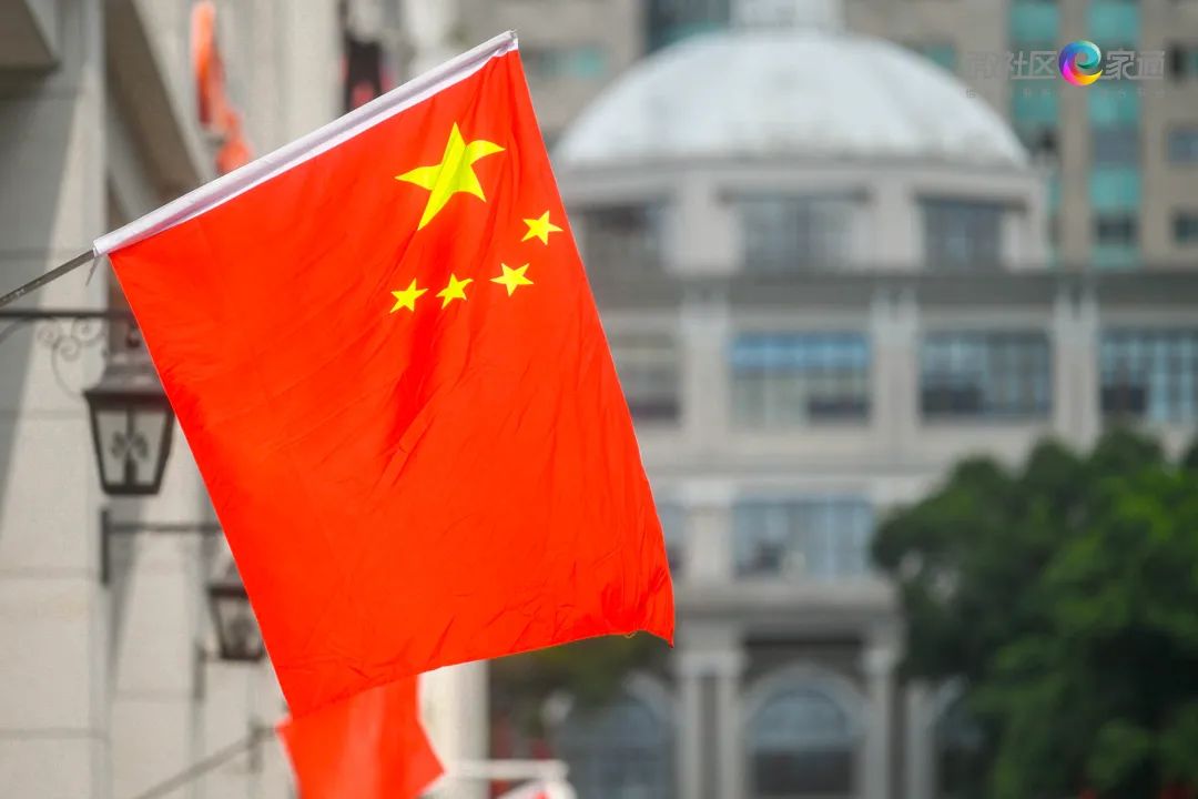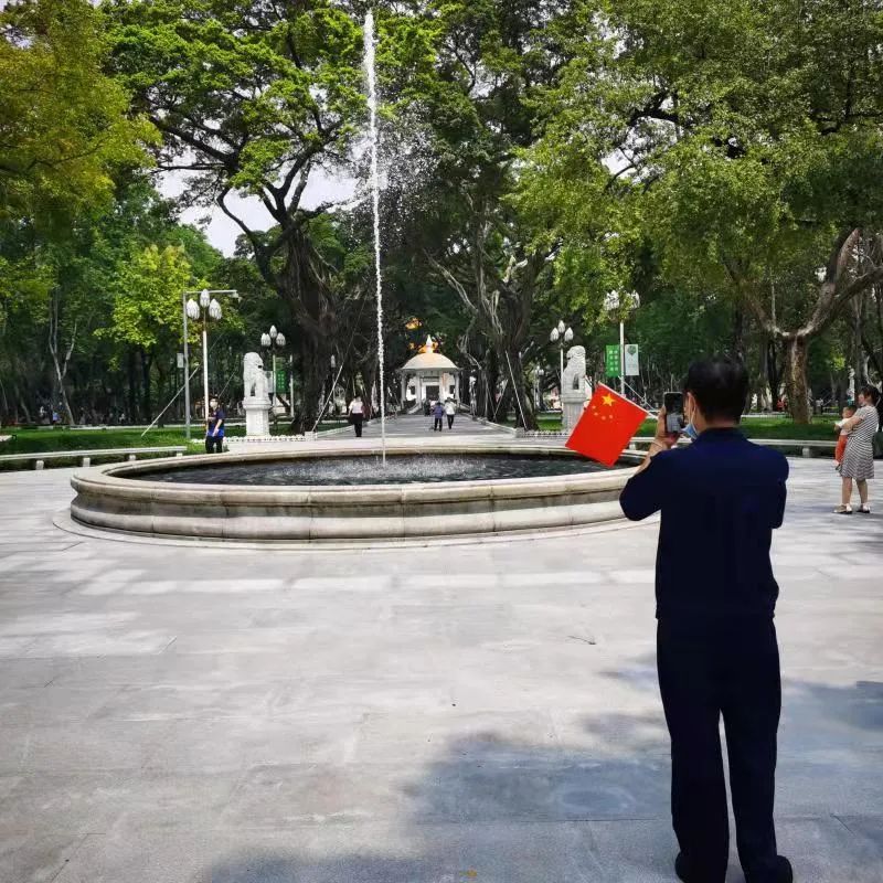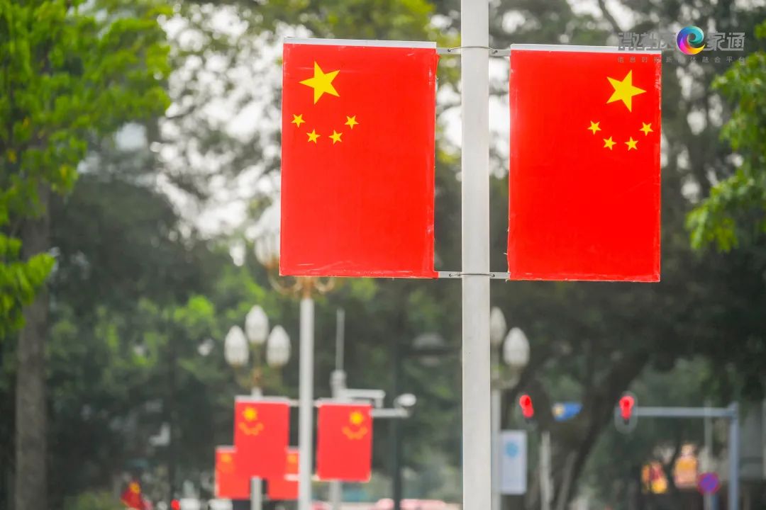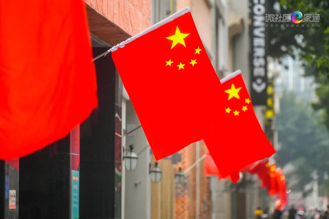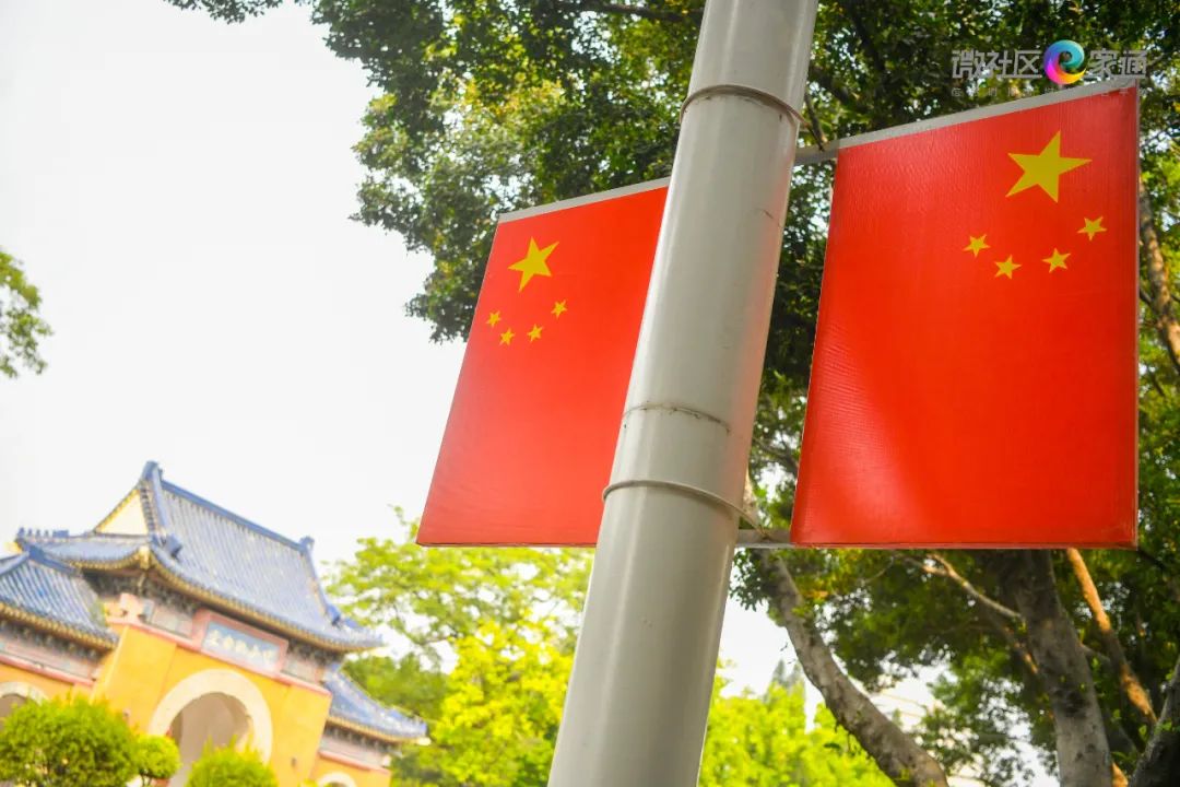 目前在北京路步行街、中山五路、东风东路、吉祥路、连新路以及社区各处,都可以看到鲜艳的五星红旗随风飘扬,不少过路市民拿出手机“打卡”留念。