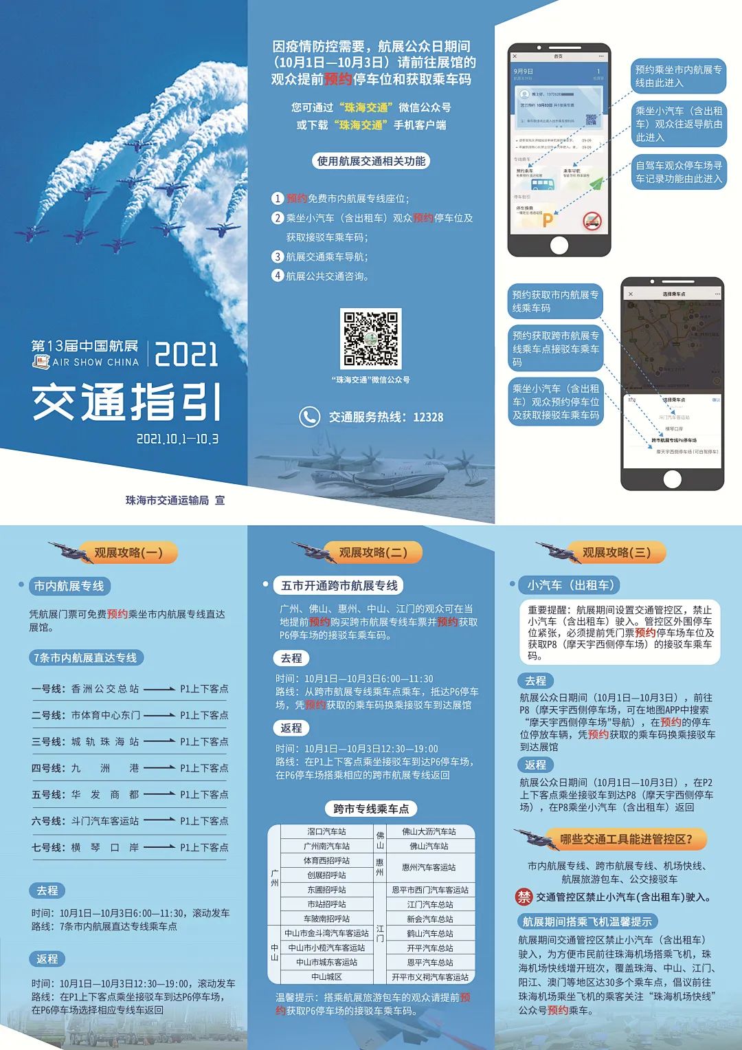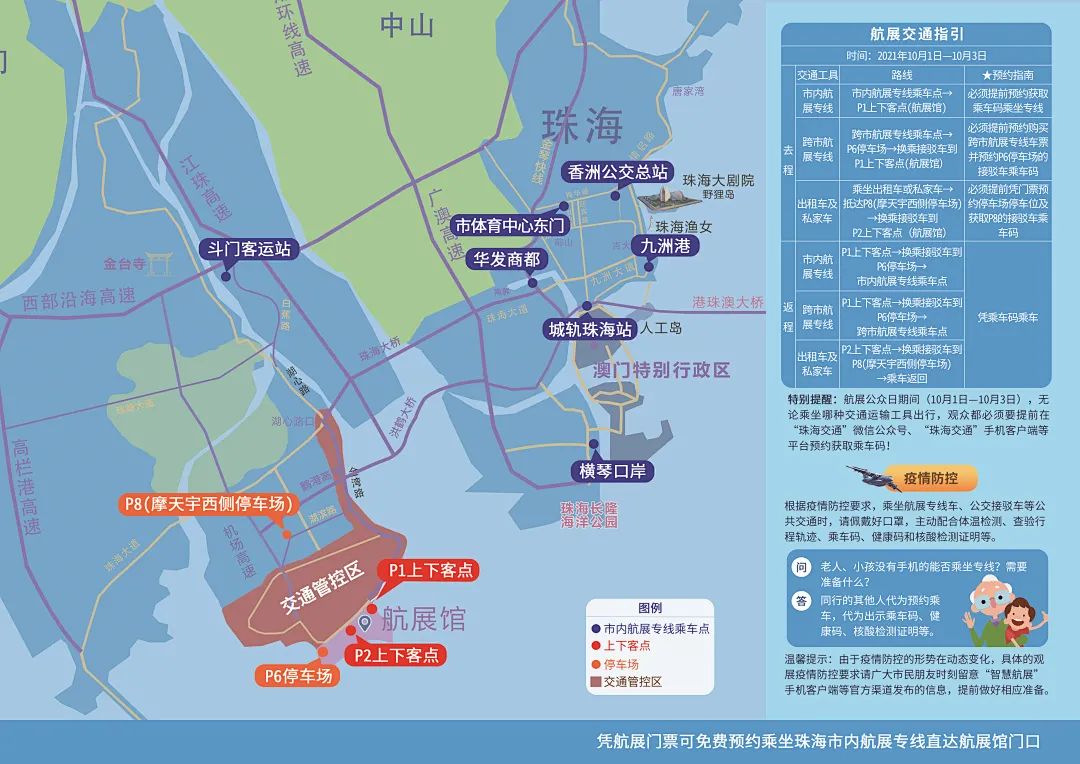 跨市专线:10月1日-3日期间,有跨市航展专线往返于广州、佛山、惠州、中山、江门至珠海间。跨市航展专线须提前购票预约座位以及凭门票提前预约获取接驳车乘车码。