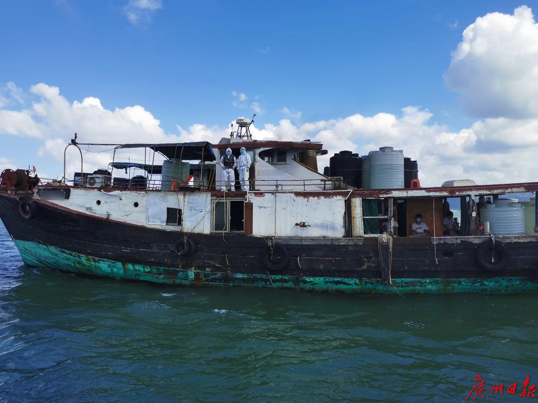 (广东海警摩托艇靠泊“酒店船”进行检查)