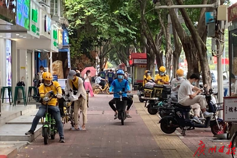 (临近中午,广州一街上许多外卖骑手在忙碌。)