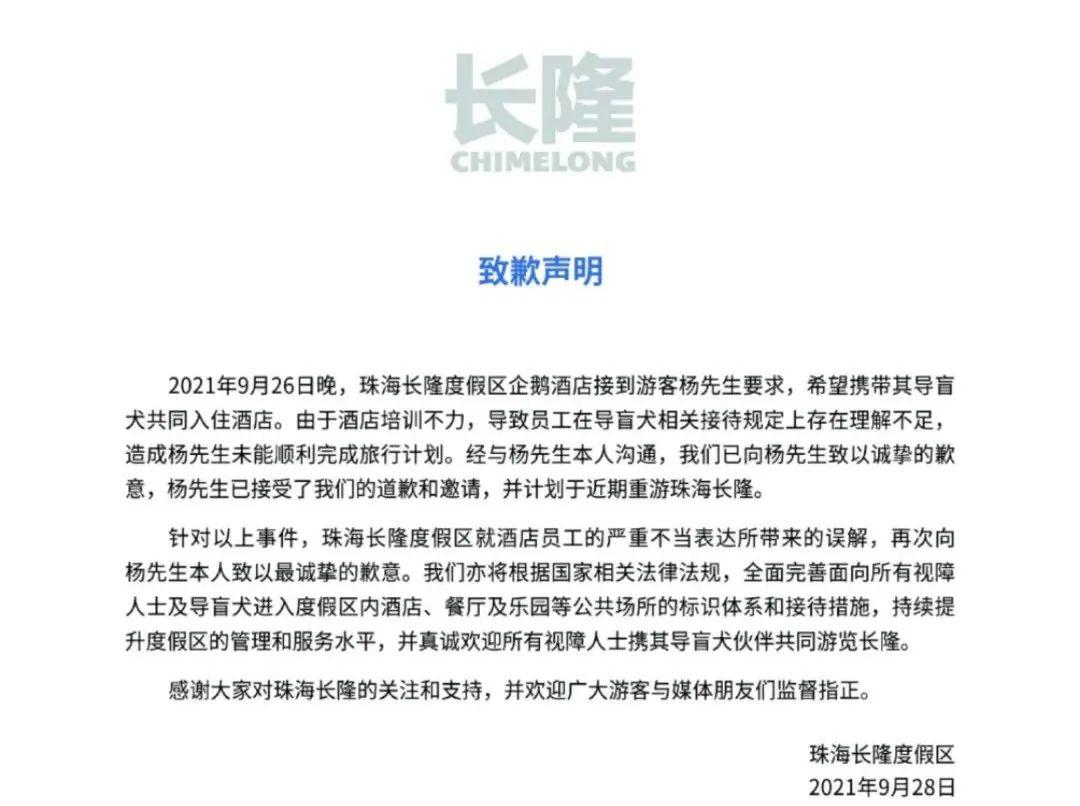该致歉声明称,9月26日晚,珠海长隆度假区企鹅酒店接到游客杨先生要求,希望携带其导盲犬共同入住酒店。由于酒店培训不力,导致员工在导盲犬相关接待规定上存在理解不足,造成杨先生未能顺利完成旅行计划。经与杨先生本人沟通,已向杨先生致以诚挚的歉意,杨先生已接受了道歉和邀请,并计划于近期重游珠海长隆。
