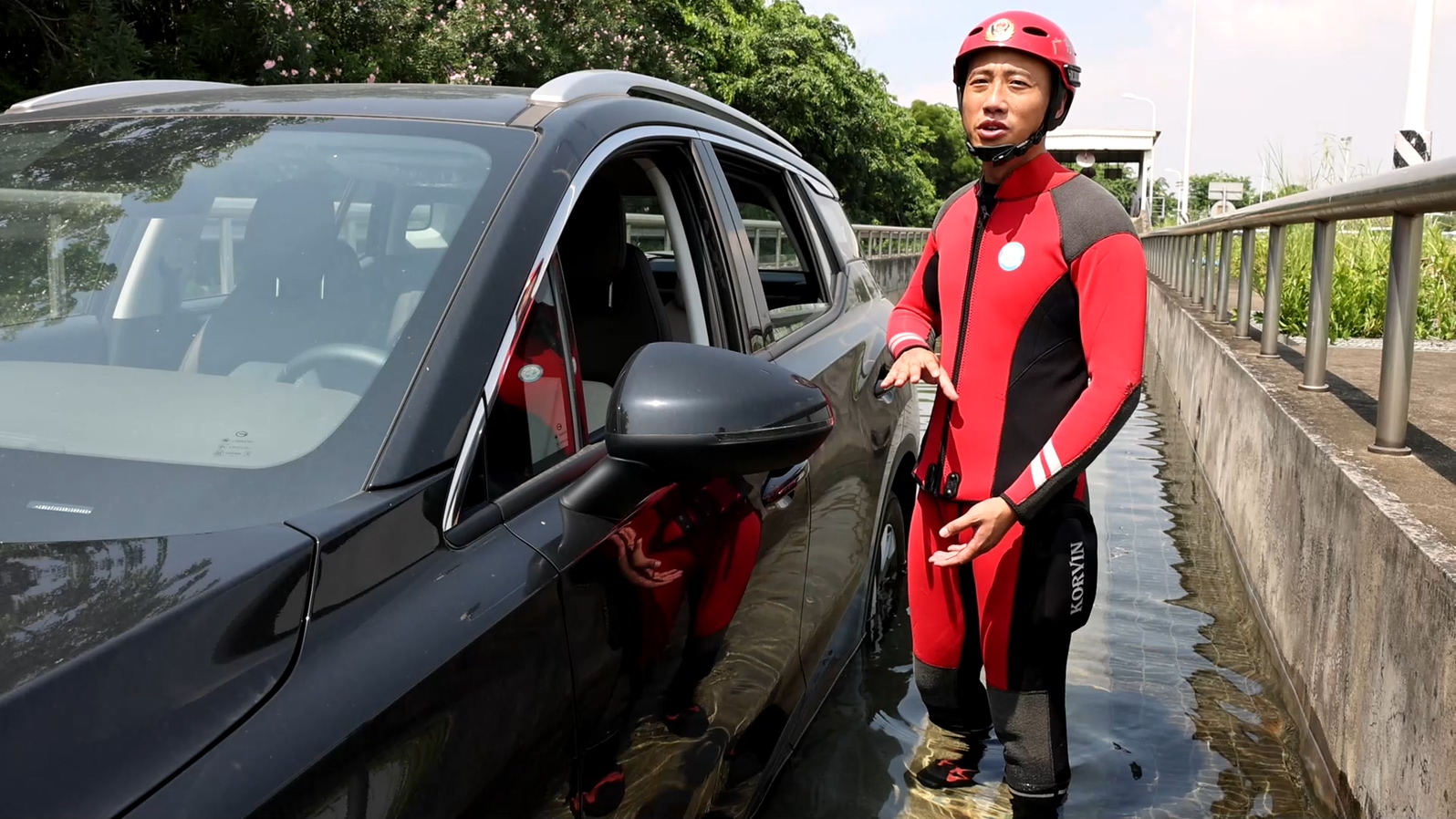 近日,广州市消防救援支队大学城消防救援站站长刘欢带领记者一行来到汽车涉水实验场,针对车辆落水后的黄金逃生自救常识进行了科普实操。