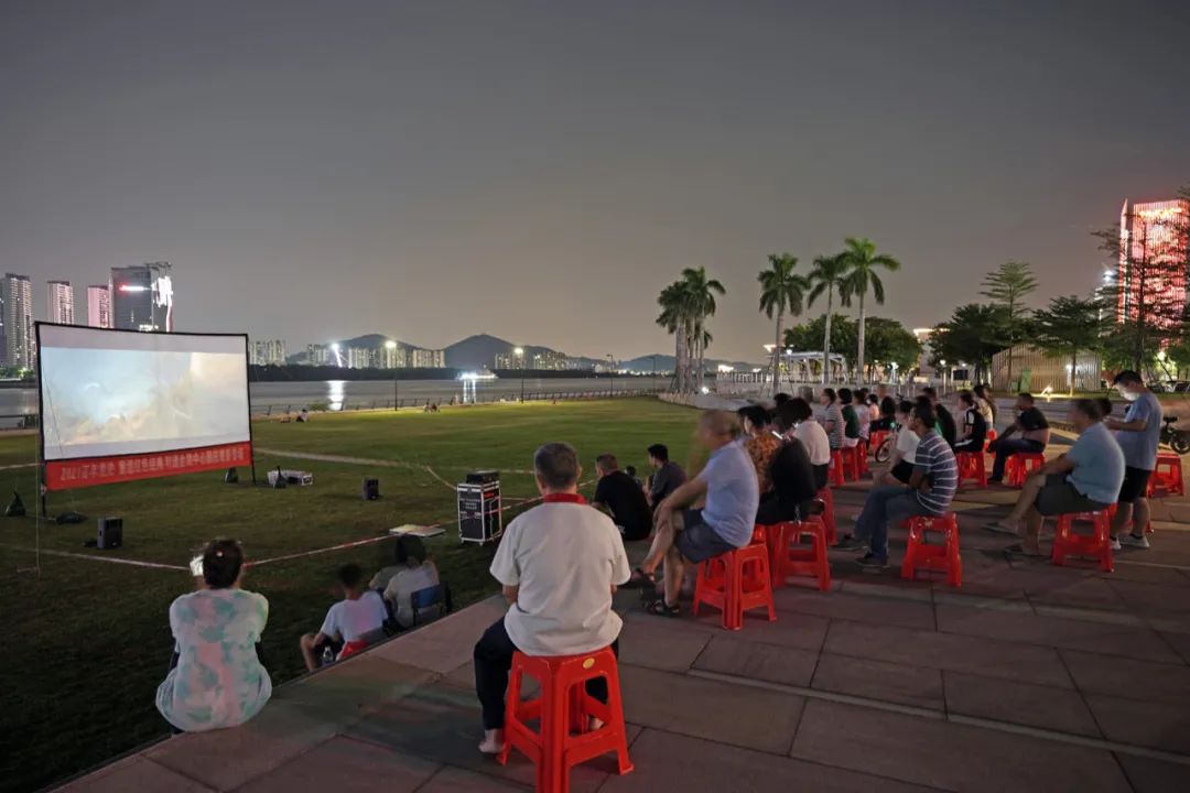晚风徐徐,7点不到,市民们便在明珠湾水舞广场露天“电影厅”集合,等待着今日份的电影“投喂”。《建国大业》《战狼2》《湄公河行动》......一批优质影片全面就位,连续七个晚上将不同的精彩呈现在市民面前,还有无人商品贩卖小车在一旁,为电影之夜的零食供给增添几分科技味道。