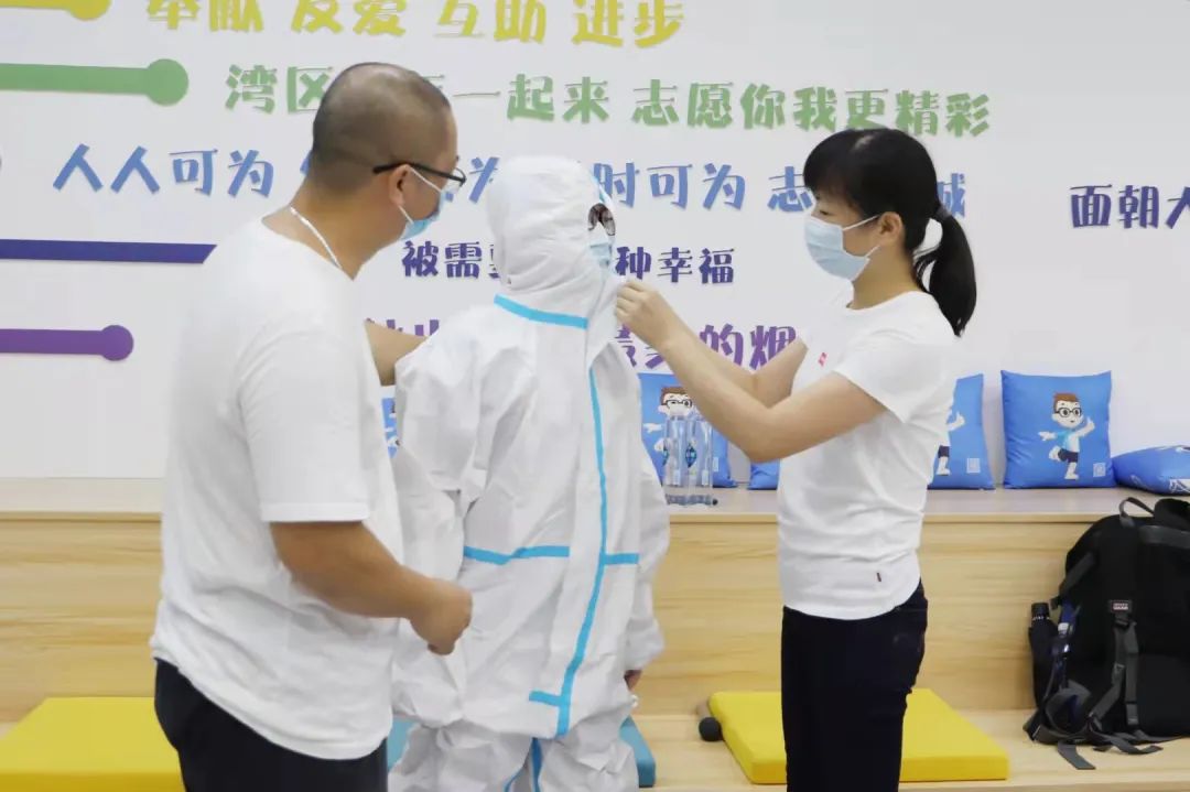 紧接着,在“新时代”青年志愿谷,小朋友们在医护人员的专业指导下,体验穿着全套防控隔离服,零距离直观地感受父母在防疫一线工作的辛苦与不易。