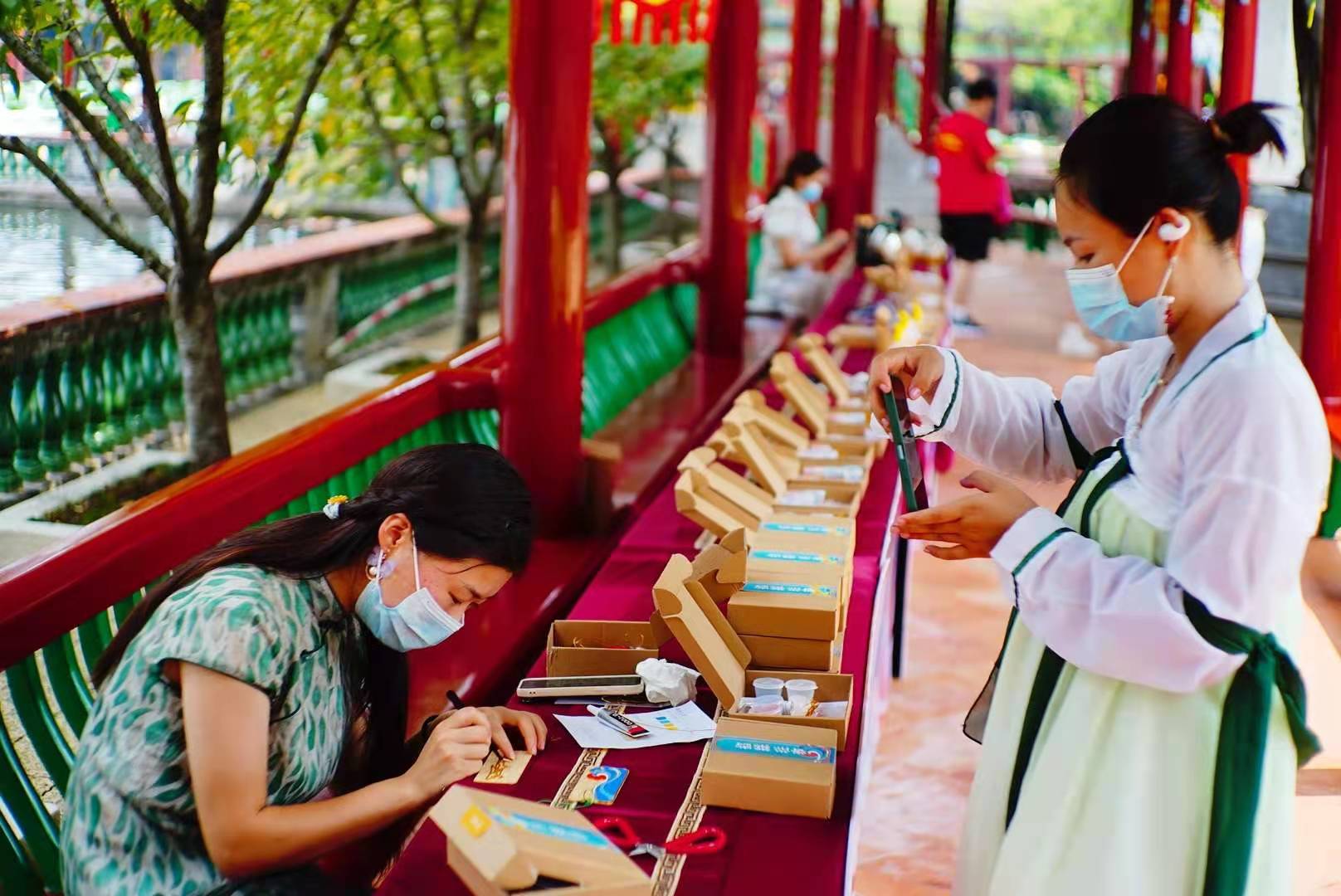 国庆节假期期间,广东省博物馆举办了“非遗新国宝 国庆会国潮—广州市新入选国家级非遗代表性项目体验季”,开展岭南插花、中医养生讲座和国家级非遗项目游园活动,每天都迎来不少游客体验。在广州塔首层,假期里正举办“记录我们的新时代—广州非遗新作品展”,展出了100件广州非遗新作品,让人叹为观止。宝墨园在岭南园林里开起了非遗潮墟,邀请一批非遗大师现场展示牙雕、广绣、灰塑、榄雕、剪纸、灯芯草制作、书法篆刻等民俗工艺,景区还将岭南文化通过各种表演呈现,紫坭春色、木偶剧等非遗文化表演丰富假期生活。“没想到非遗文化可赏、可看、还可学,真是太难忘了!”有游客对景区里展示的非遗技艺赞不绝口,还不忘挑选工艺作品带回家留作纪念。